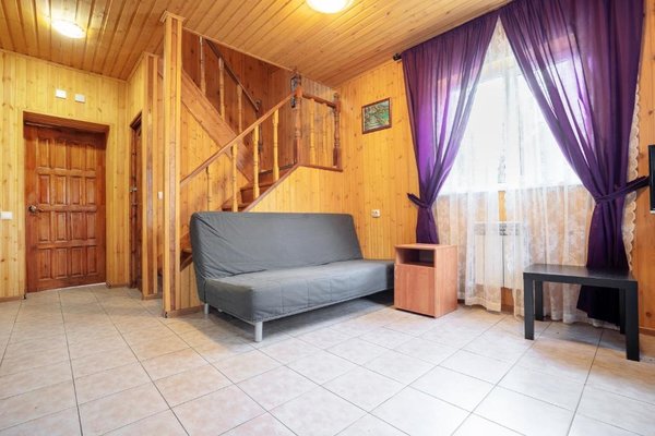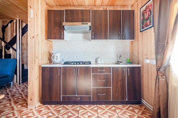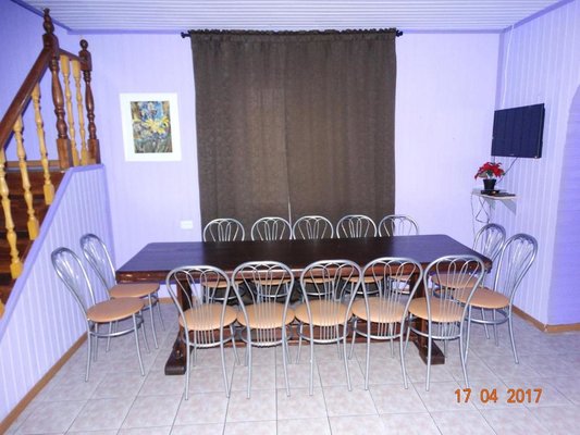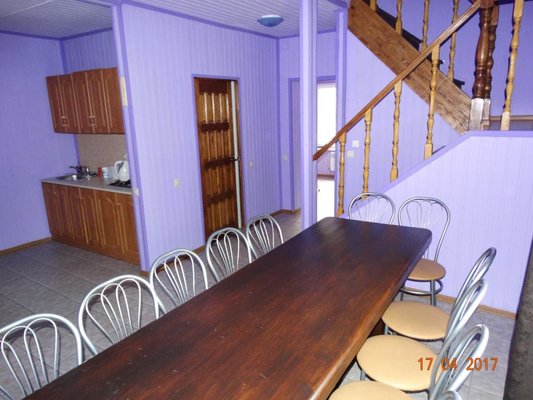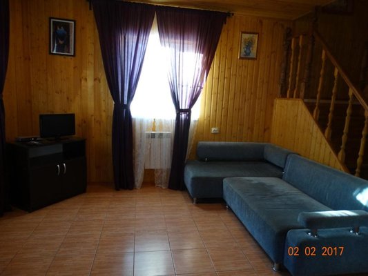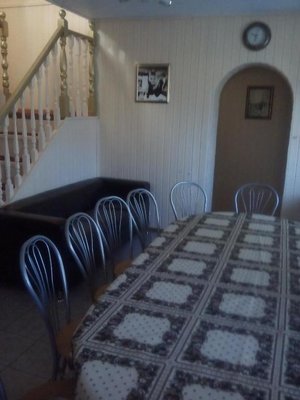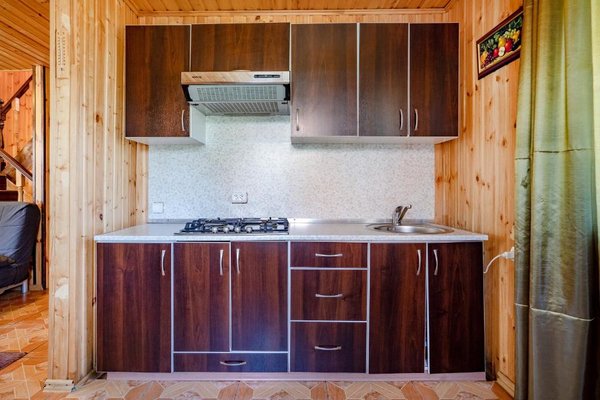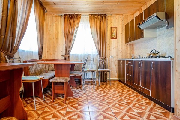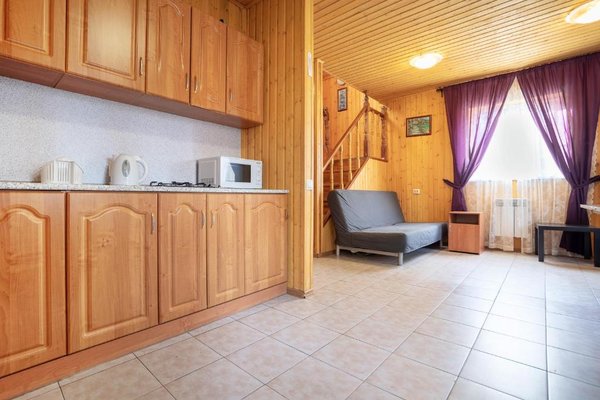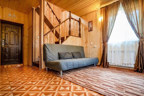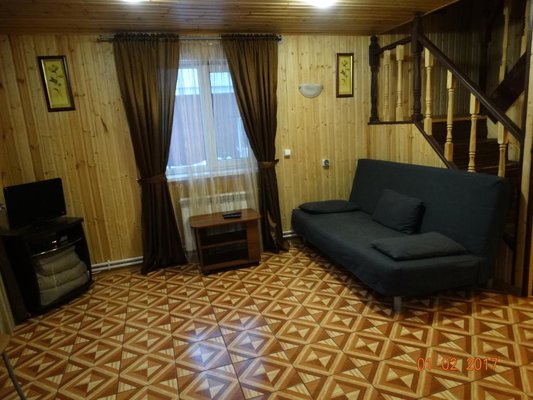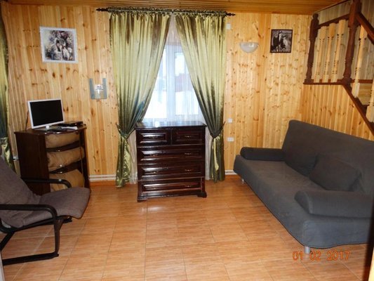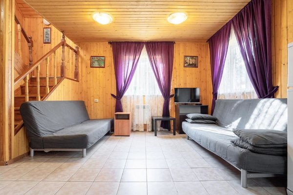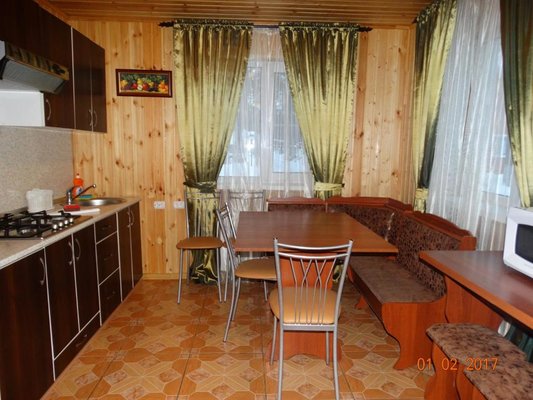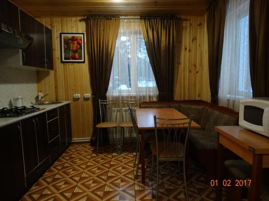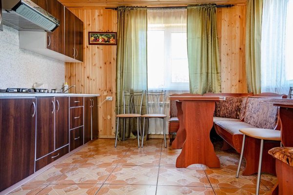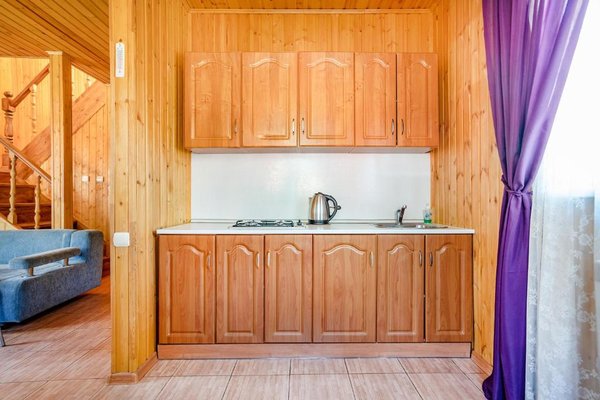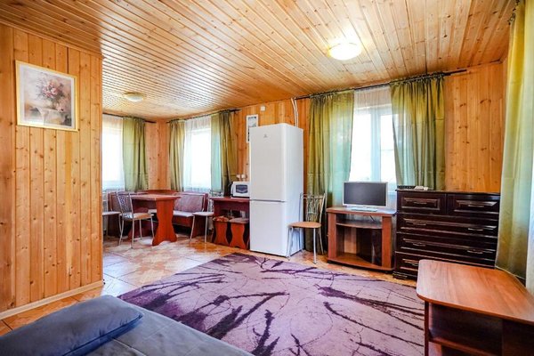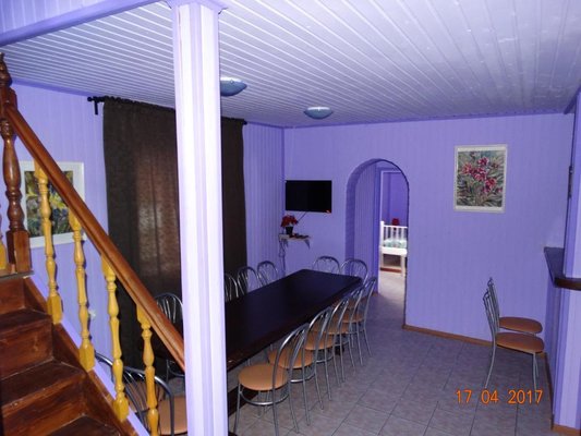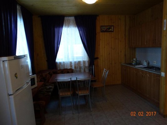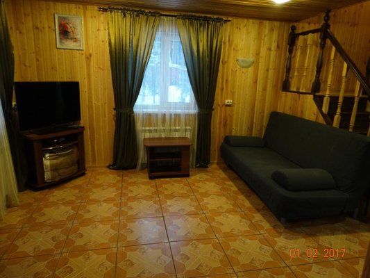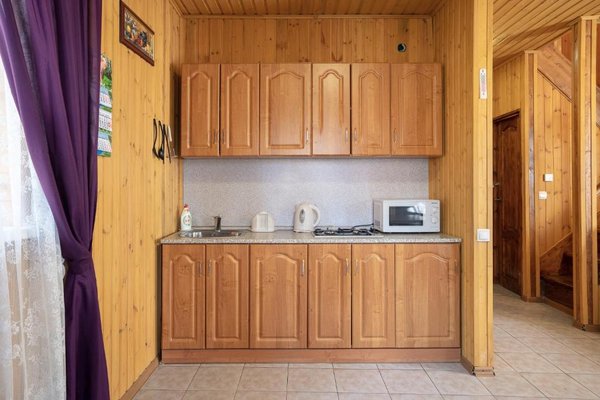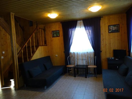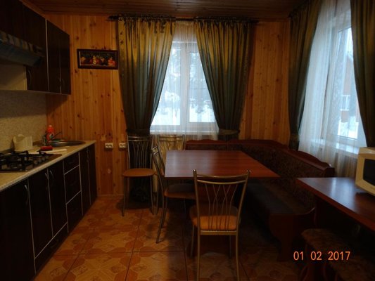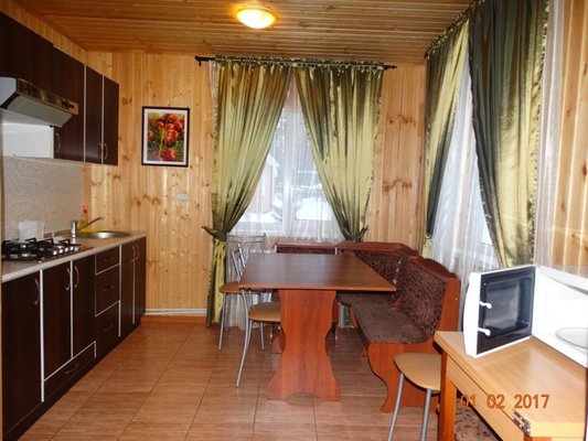 На 1-ом этаже : веранда с барной стойкой, кухонный стол, кухонные принадлежности: необходимая посуда, микроволновая печь; бильярдный стол – американка, спутниковое TV с караоке, сауна на дровах и купель с прохладной родниковой водой 3,5 х 2,5 м.