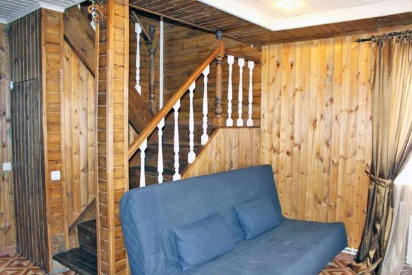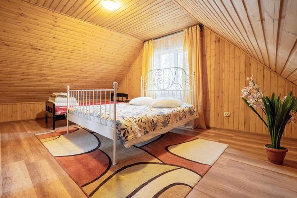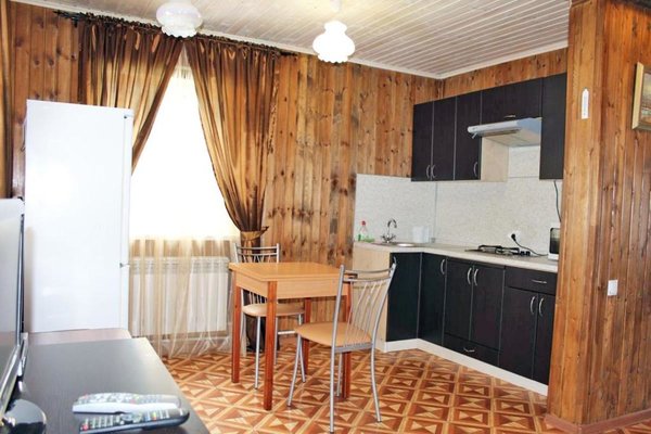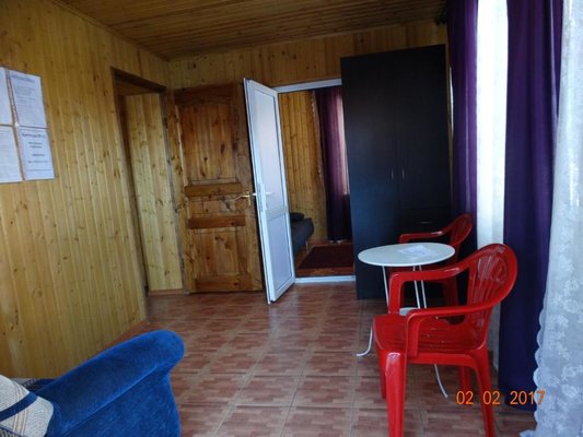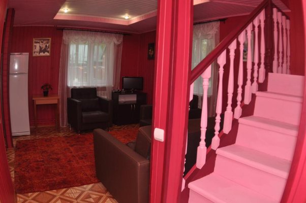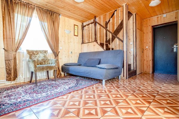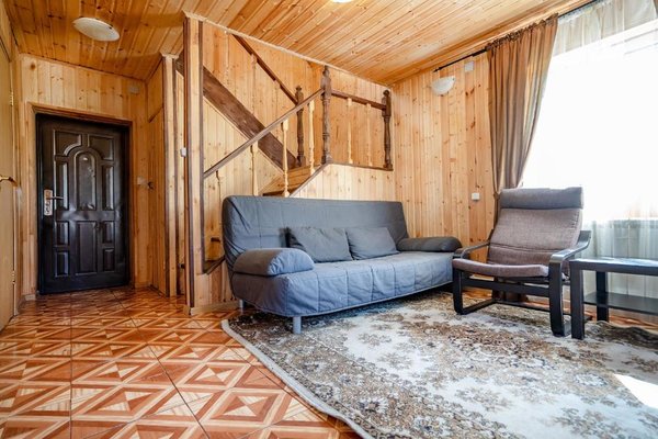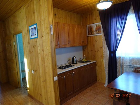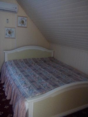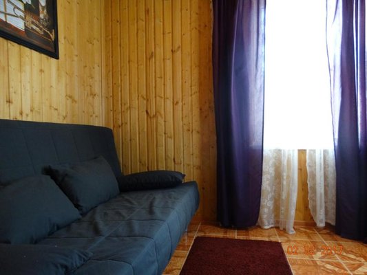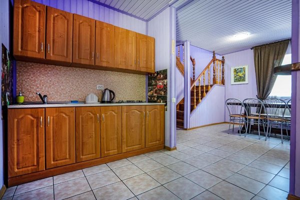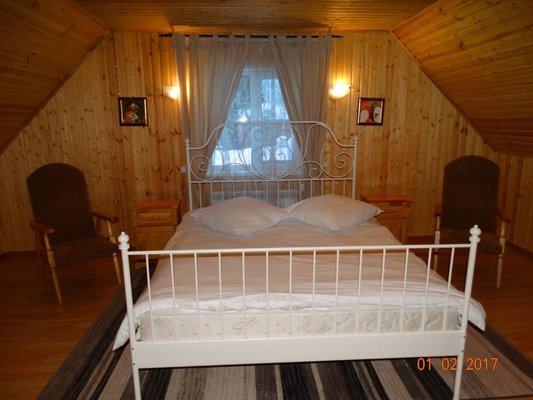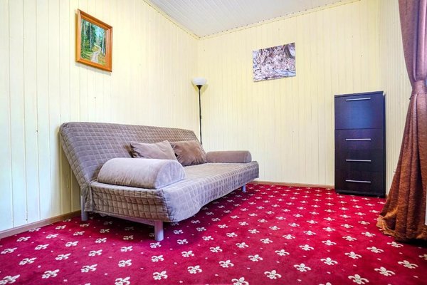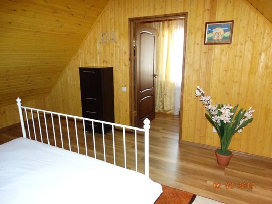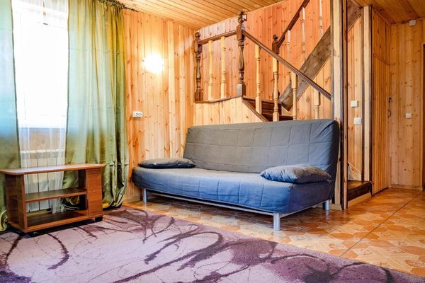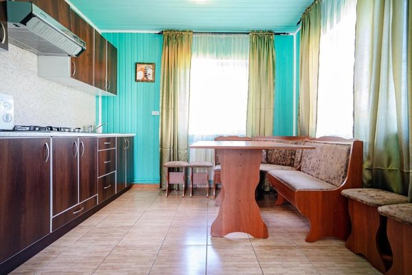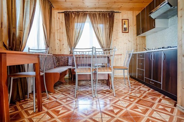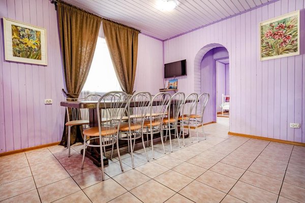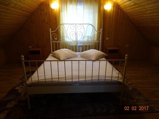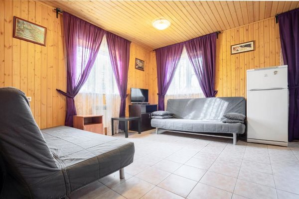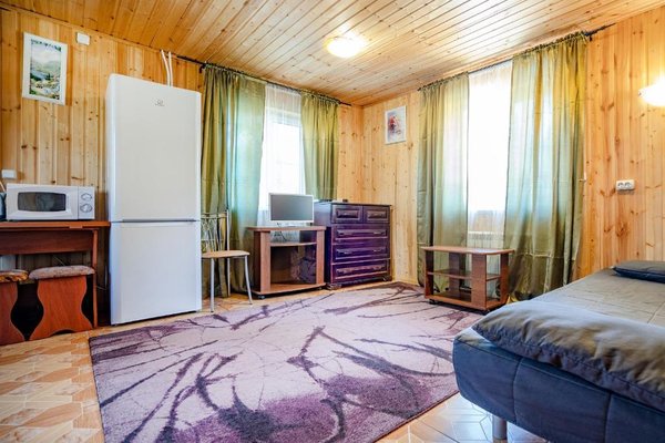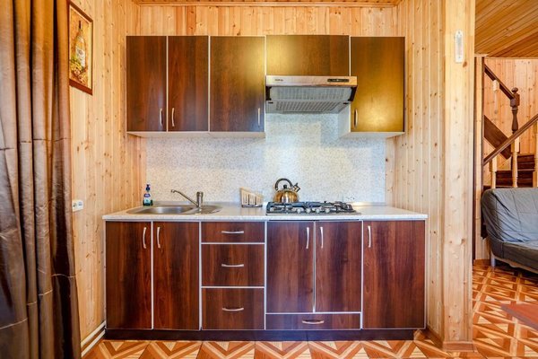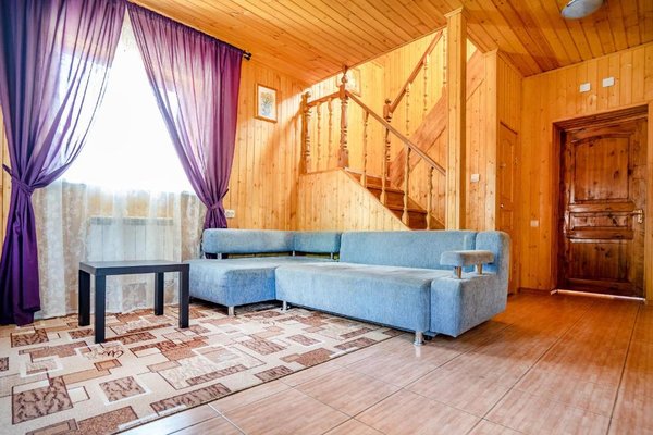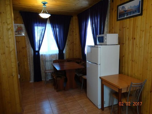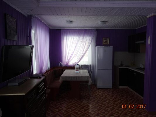На 1-ом этаже : веранда с барной стойкой, кухонный стол, кухонные принадлежности: необходимая посуда, микроволновая печь; бильярдный стол – американка, спутниковое TV с караоке, сауна на дровах и купель с прохладной родниковой водой 3,5 х 2,5 м.