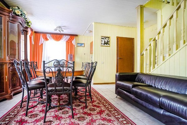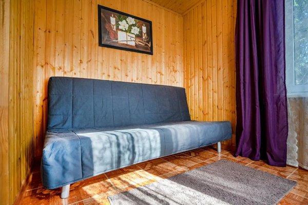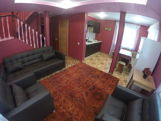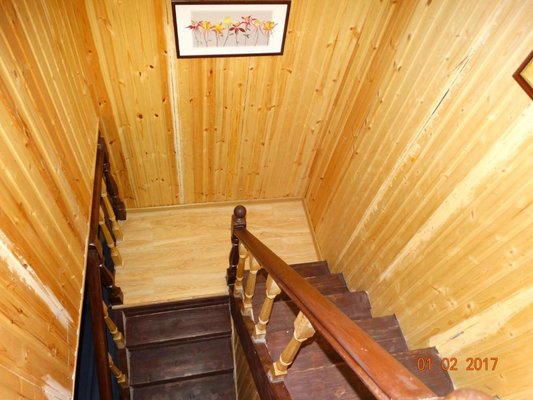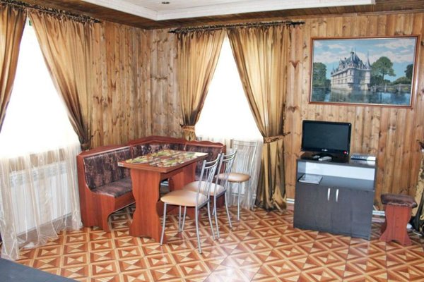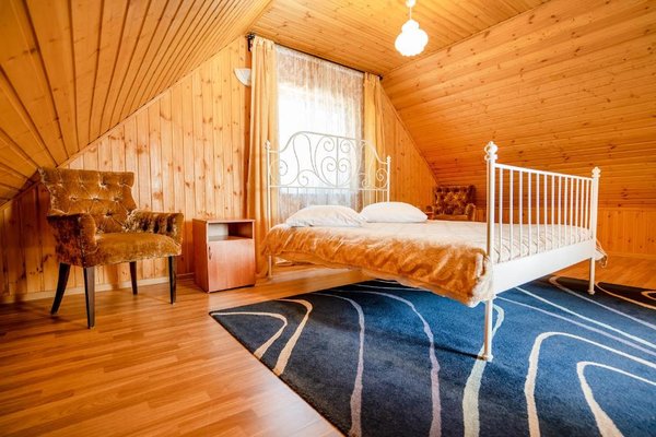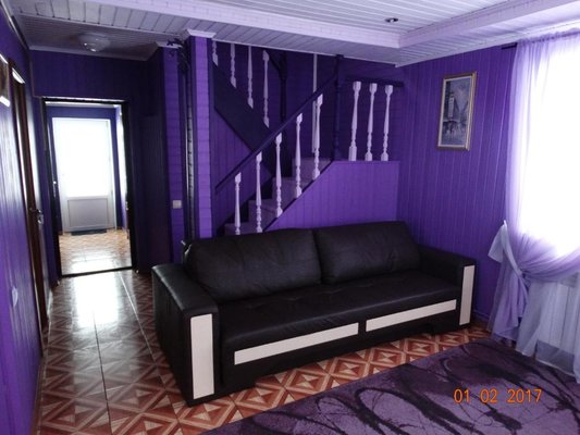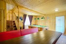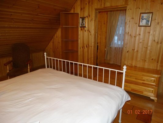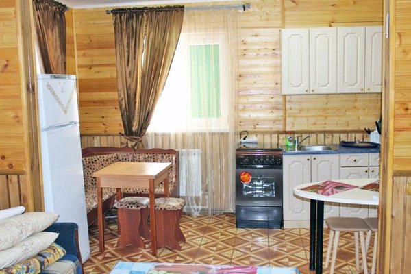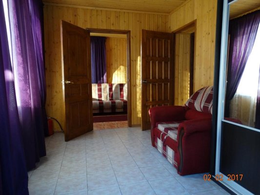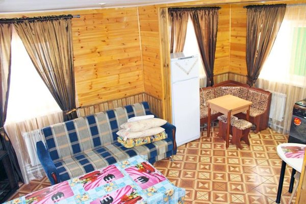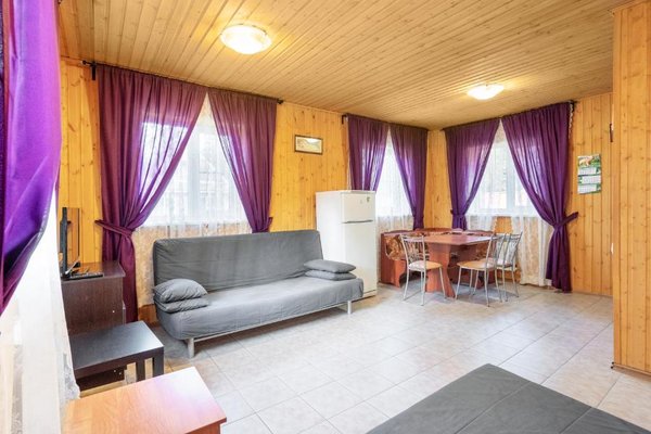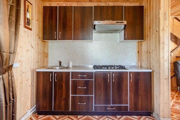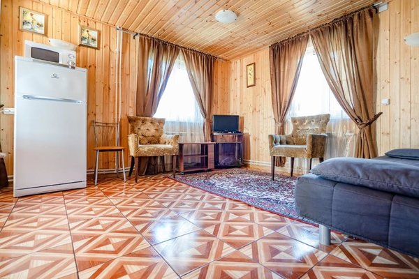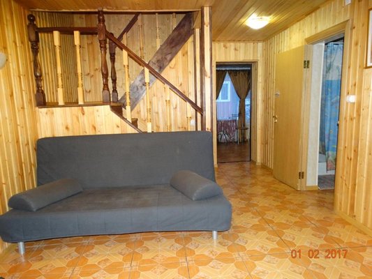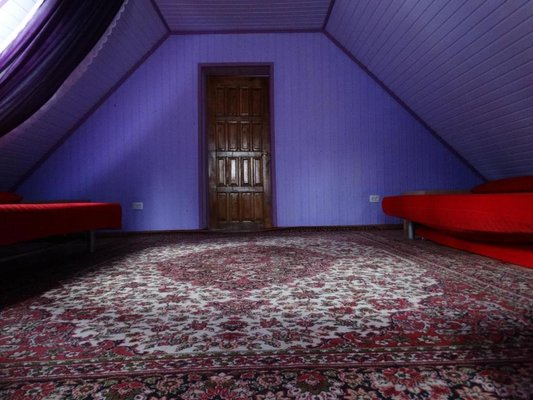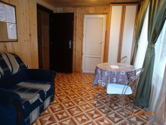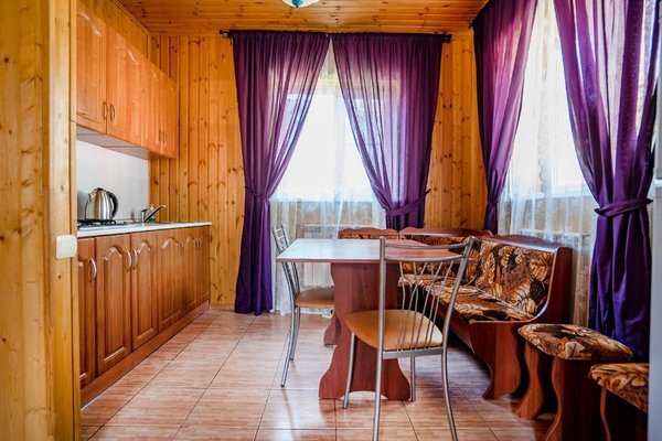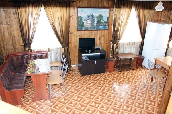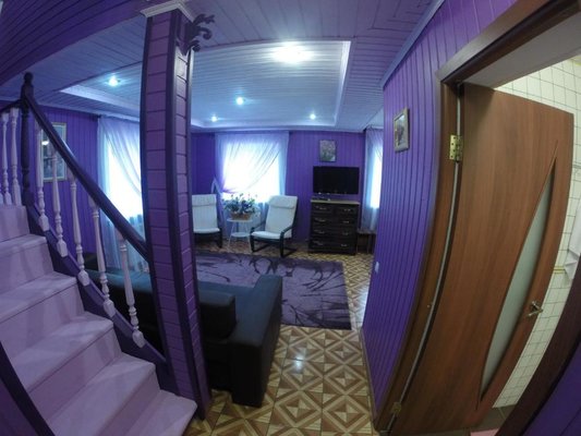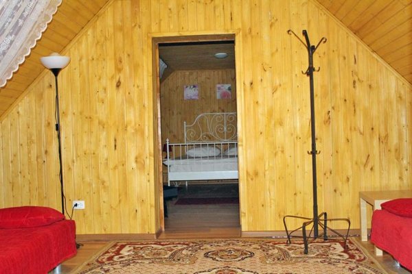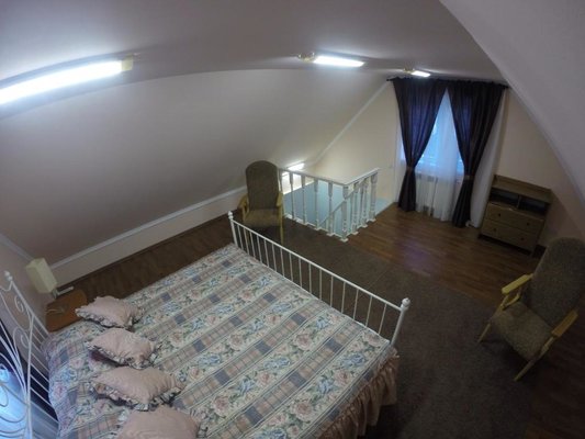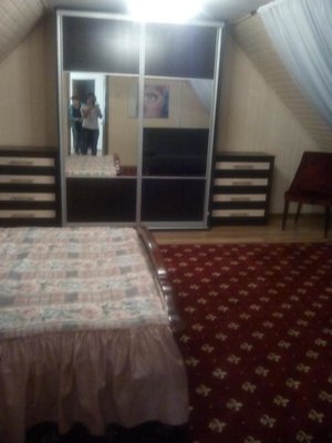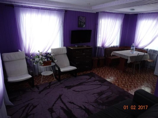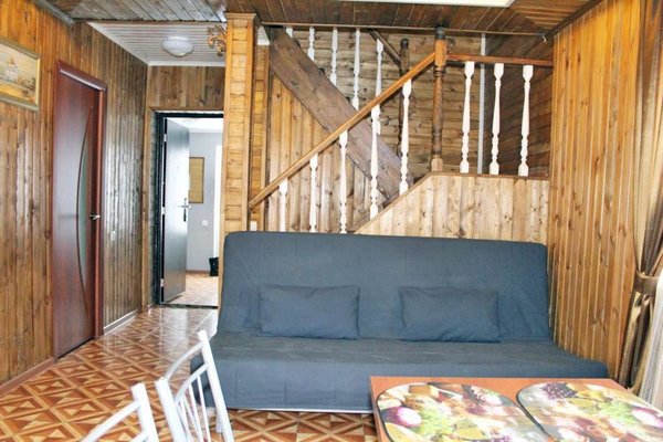 На 1-ом этаже : веранда с барной стойкой, кухонный стол, кухонные принадлежности: необходимая посуда, микроволновая печь; бильярдный стол – американка, спутниковое TV с караоке, сауна на дровах и купель с прохладной родниковой водой 3,5 х 2,5 м.