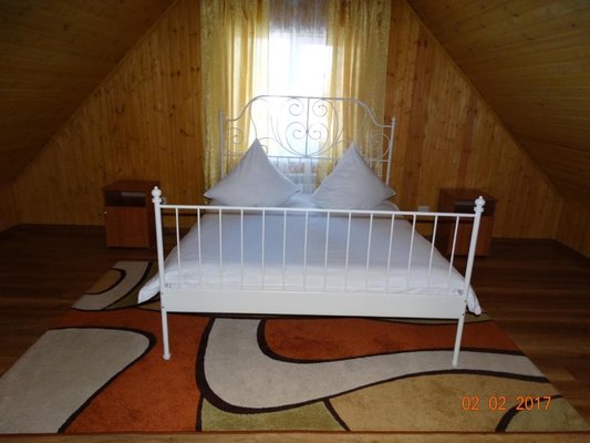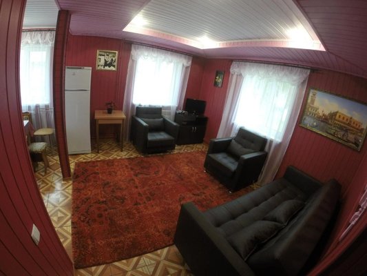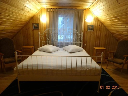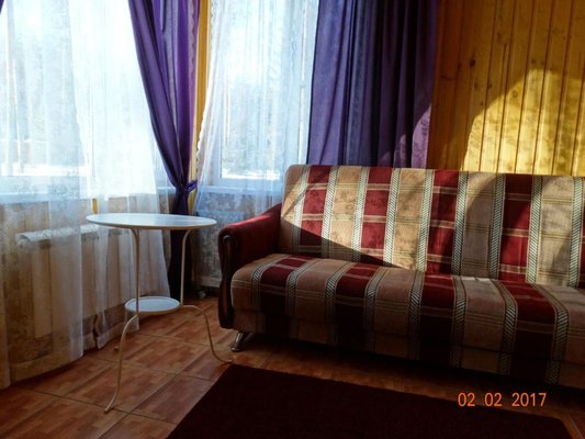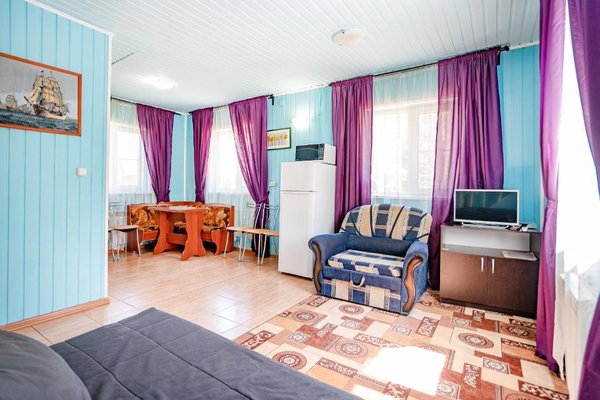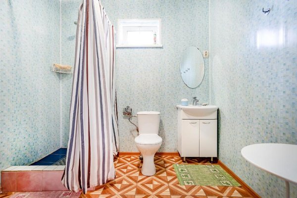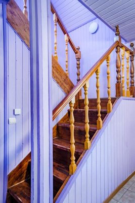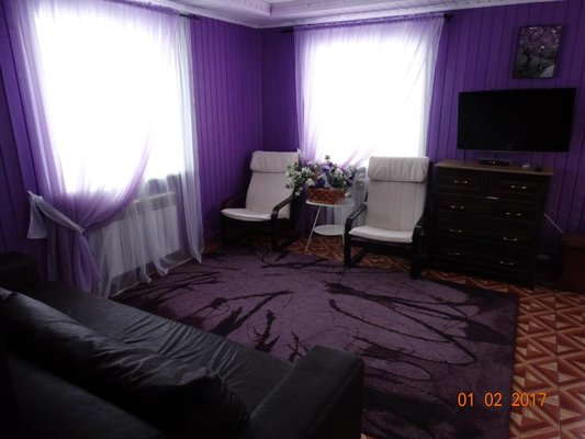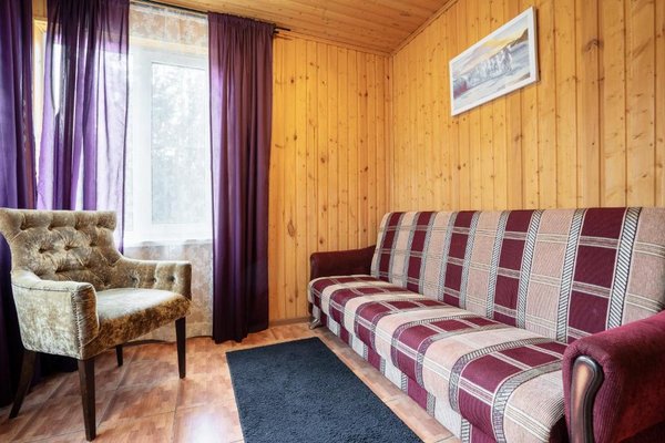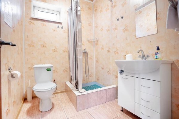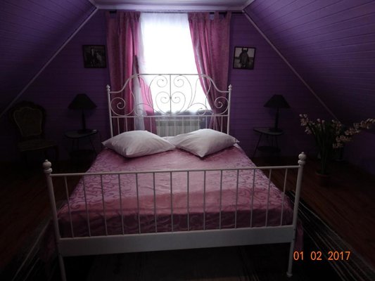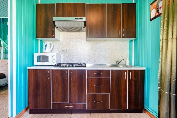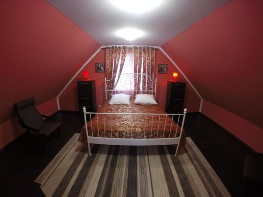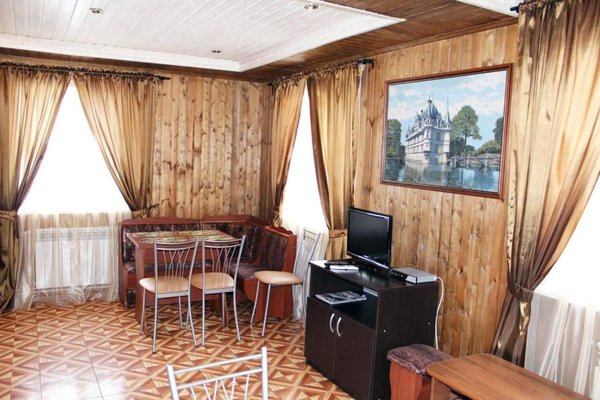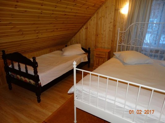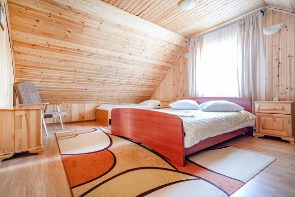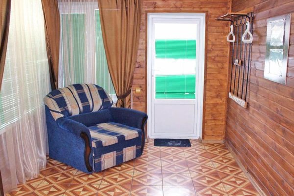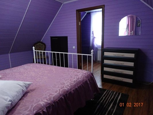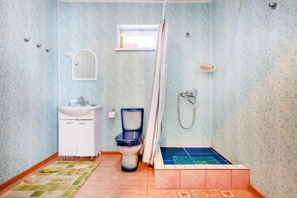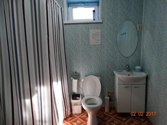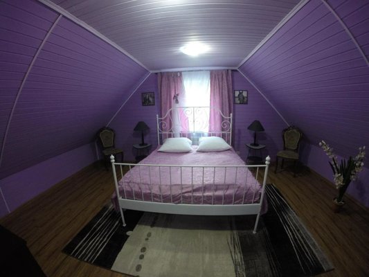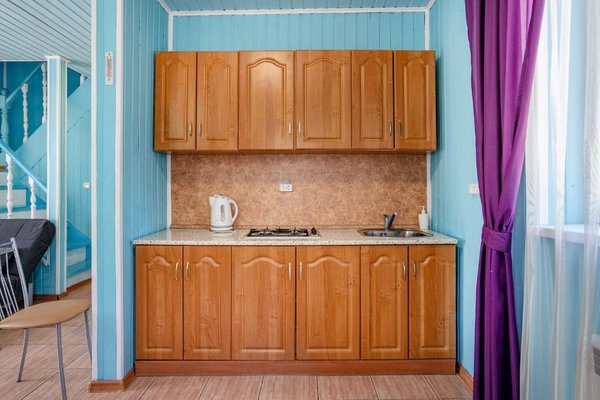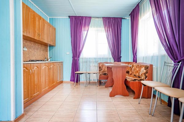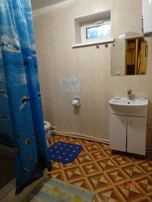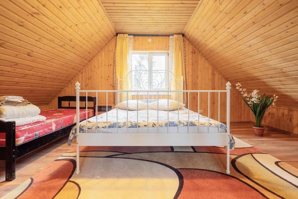 На 1-ом этаже : веранда с барной стойкой, кухонный стол, кухонные принадлежности: необходимая посуда, микроволновая печь; бильярдный стол – американка, спутниковое TV с караоке, сауна на дровах и купель с прохладной родниковой водой 3,5 х 2,5 м.