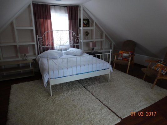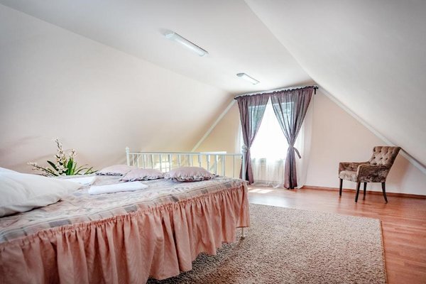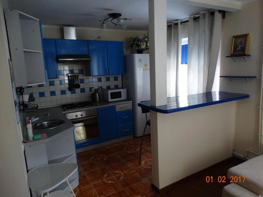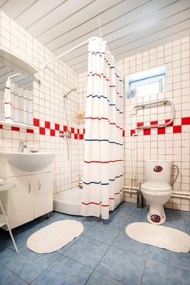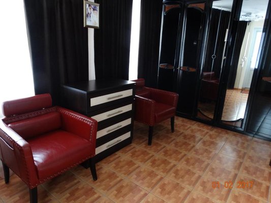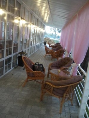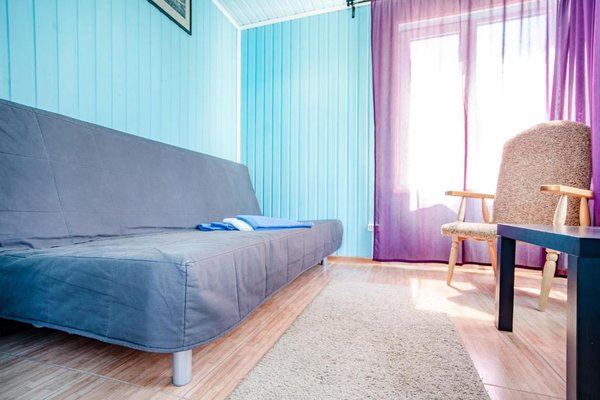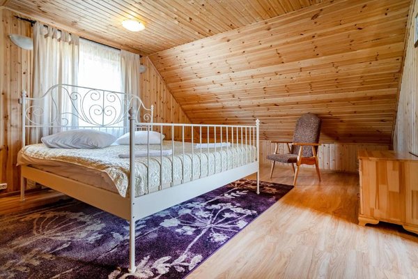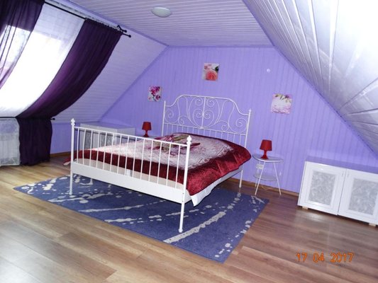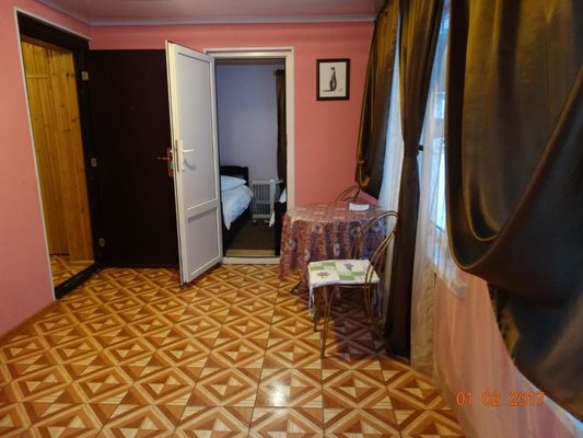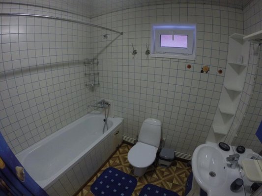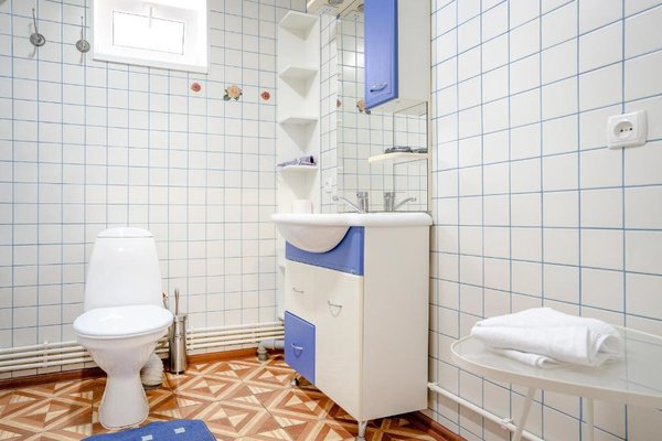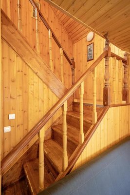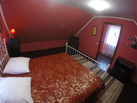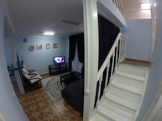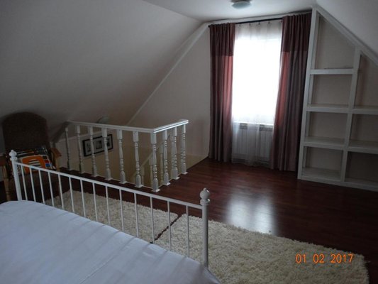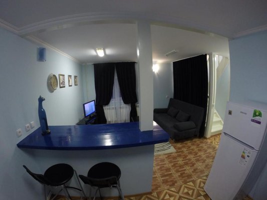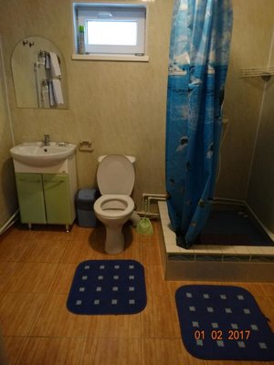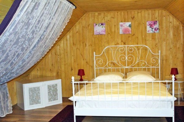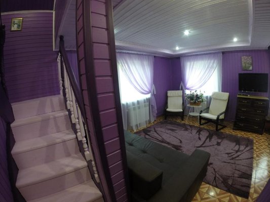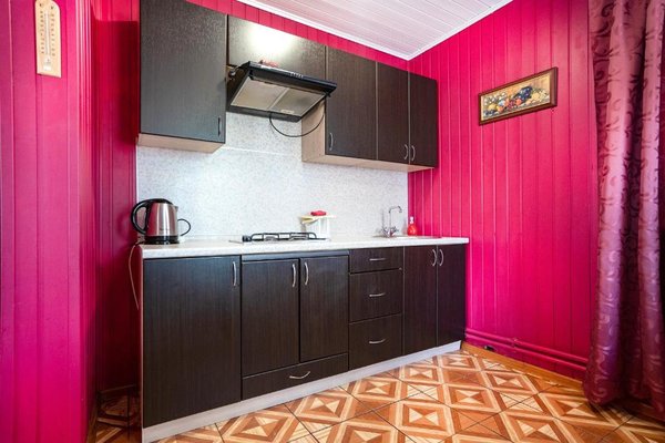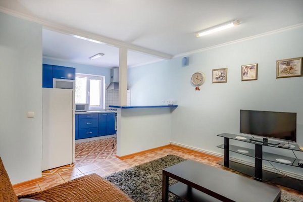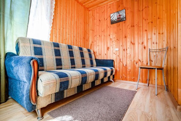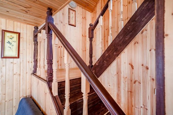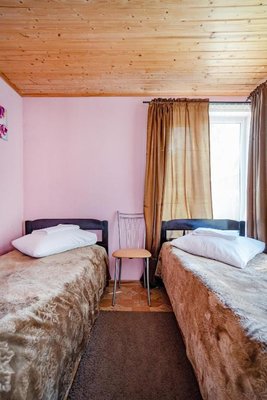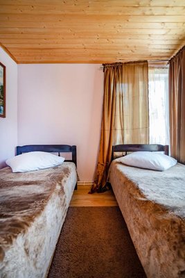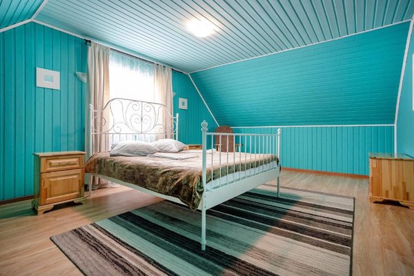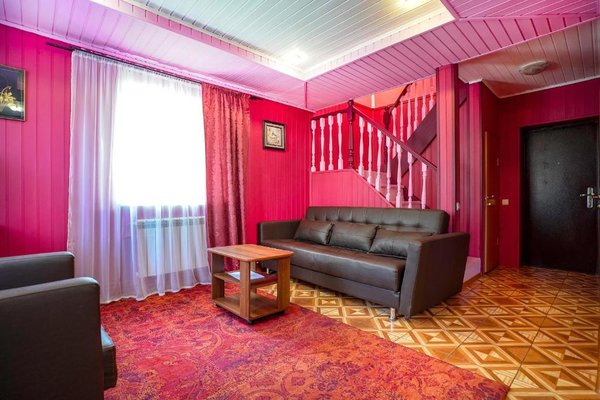 На 1-ом этаже : веранда с барной стойкой, кухонный стол, кухонные принадлежности: необходимая посуда, микроволновая печь; бильярдный стол – американка, спутниковое TV с караоке, сауна на дровах и купель с прохладной родниковой водой 3,5 х 2,5 м.