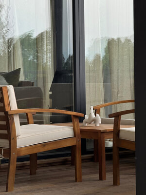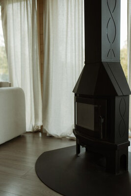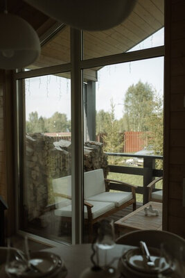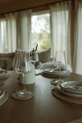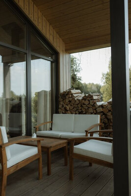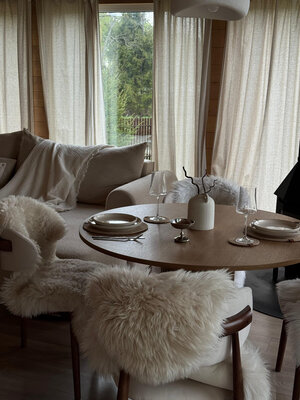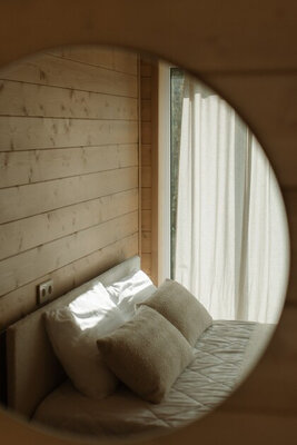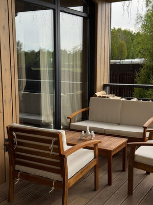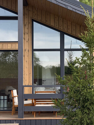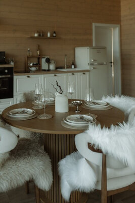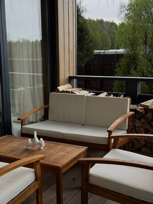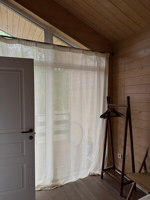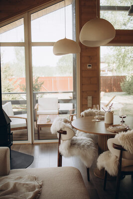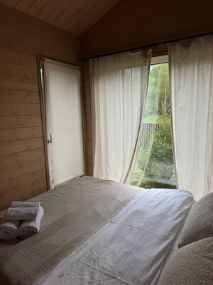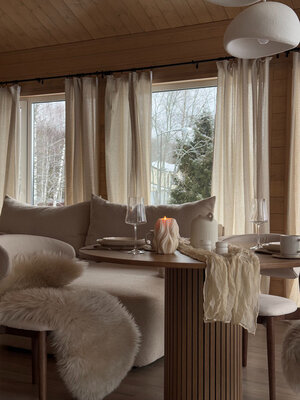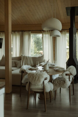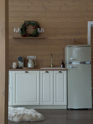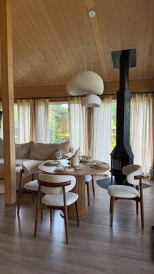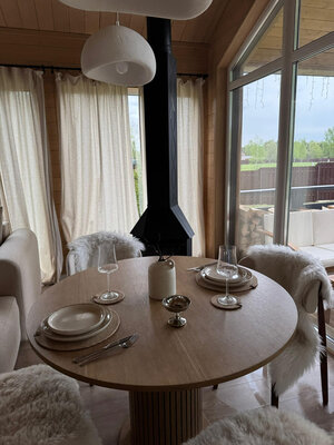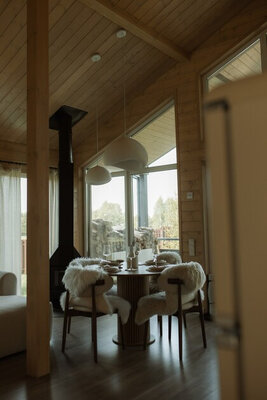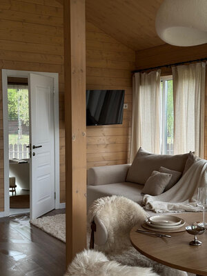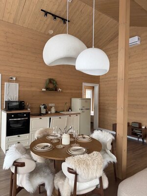 Внутри вас ждет идеальный баланс современного дизайна и душевного уюта. Две комфортабельные спальни гарантируют полноценный отдых, а просторная кухня-гостиная оснащена всем необходимым для кулинарных экспериментов. Изюминкой интерьера стала панорамная ванна с лесными видами и стильный электрический камин, создающие атмосферу релаксации. Для развлечений – проектор и культовая акустическая система Marshall.