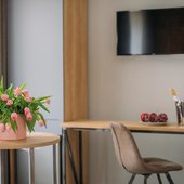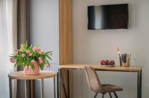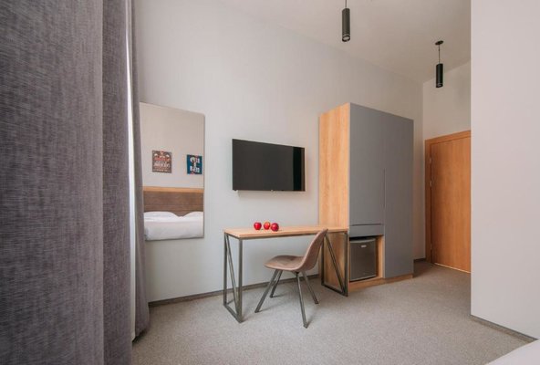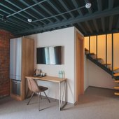 На первом этаже работает кафе, интерьер которого выдержан в стиле «лофт». В этом заведении проводят завтраки, которые можно заказать прямо в апартаменты. В другое время блюда и напитки предоставляются по меню. Если Вы не успеваете перекусить, то персонал может упаковать еду с собой.