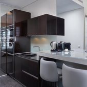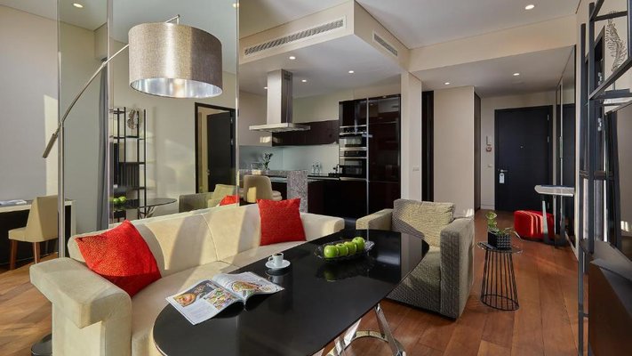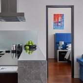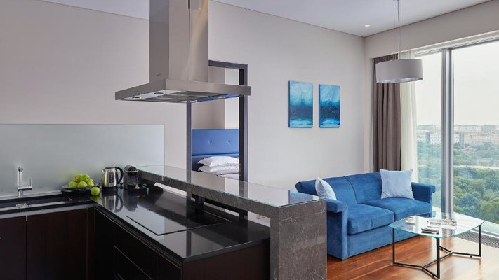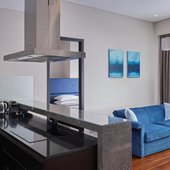 В номере оборудована кухня с электрической плитой и двумя духовыми шкафами. Также на кухне есть вместительный холодильник и электрочайник. В ресторане подаются блюда великолепного качества.