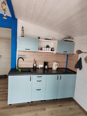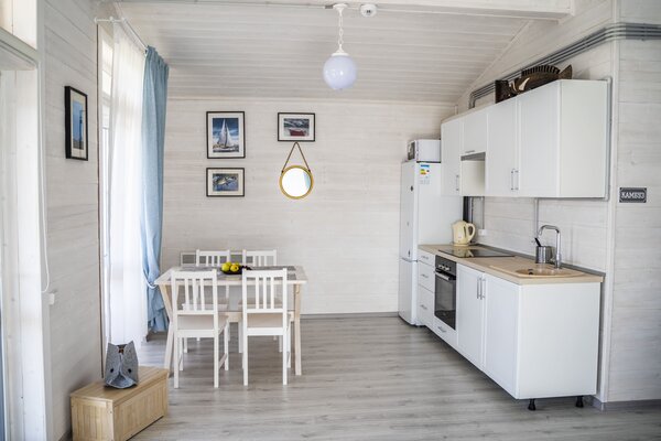 Гостевой дом построен по принципу апартаментов. В каждом номере есть кухня или кухонная зона, в которой есть все необходимое для приготовления пищи: электроплита, микроволновая печь, электрочайник, кофеварка, холодильник, полный комплект кухонной и столовой посуды и столовые приборы.