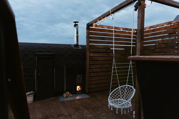 Баня-бочка. Парилка вместимостью 4-5 человек. Гостевая зона со столом и скамейками для чаепития. Отдельная комната с ушатом. Выход на террасу.