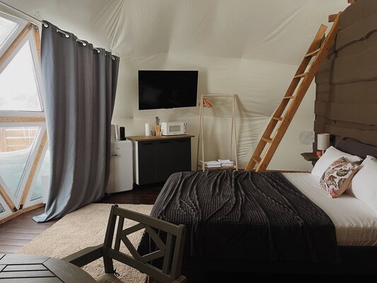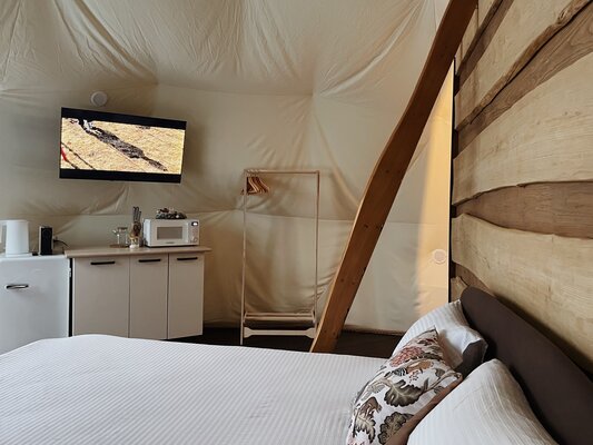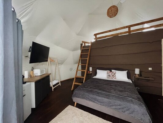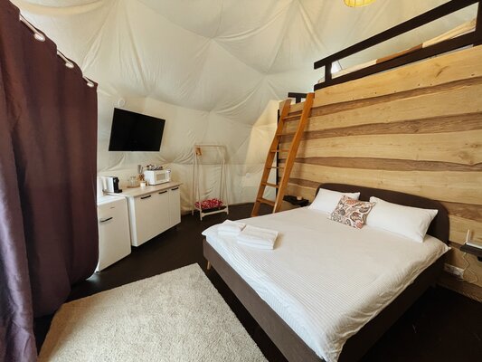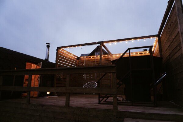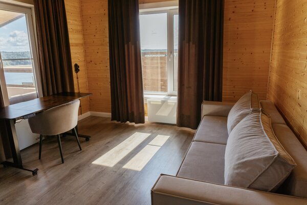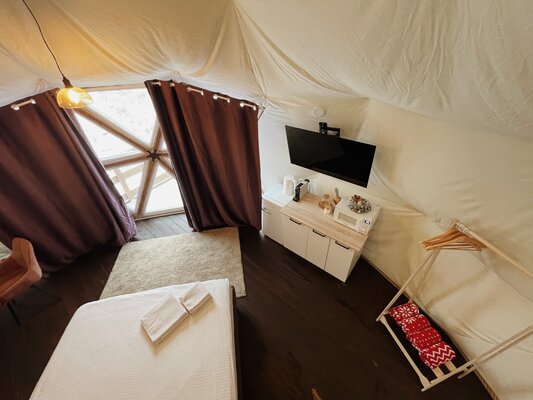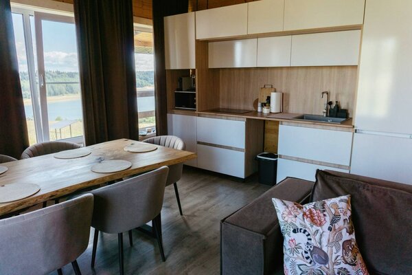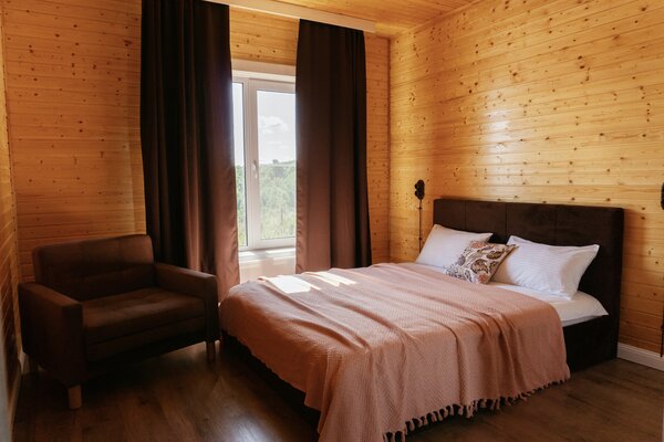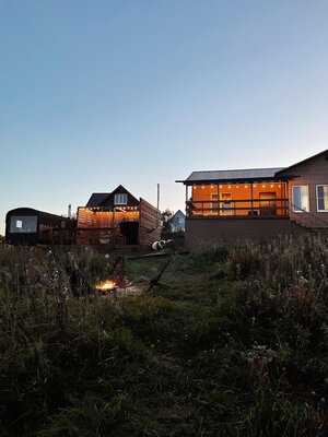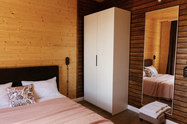 Большой дом предлагает полностью оборудованную кухню-гостиную, комфортабельные спальни, ванную комнату со стиральной машиной и прекрасный вид на реку с террасы. Сферы оснащены всем необходимым для комфортного проживания: холодильником, микроволновой печью, чайником, кофемашиной, посудой, двуспальной кроватью, телевизором и собственной костровой зоной с мангалом. Во всех помещениях установлены конвекторы для обогрева.