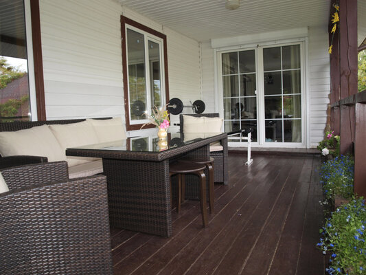 Стол на 8 человек + стол для готовки, есть рукомойник.