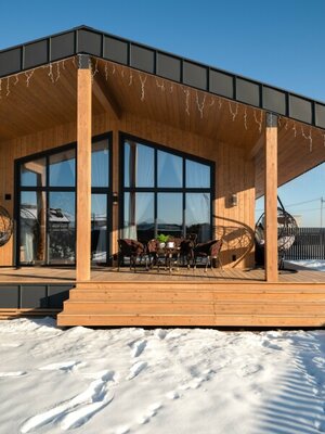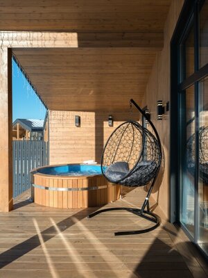 На веранде дома гостей встречает подогреваемая купель с эффектом джакузи. Вечерняя подсветка и вода комфортной температуры около 38 градусов создают идеальные условия для отдыха и наслаждения парением на свежем воздухе.