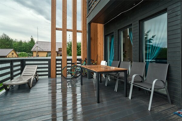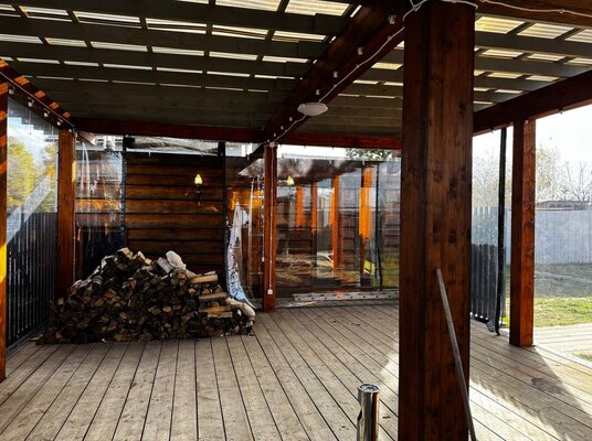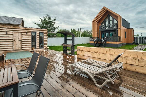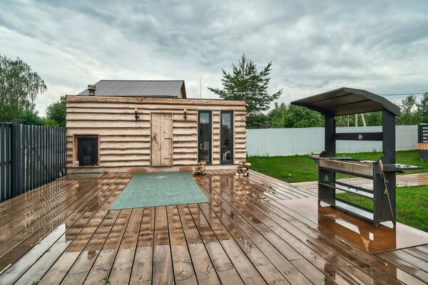 На террасе, рядом с баней, обустроена мангальная зона с шампурами, где можно приготовить аппетитные шашлыки и другие изысканные блюда на открытом огне. После кулинарных подвигов можно расположиться в удобных шезлонгах и насладиться атмосферой и трапезой в кругу близких друзей и семьи, обмениваясь улыбками и приятными моментами.
