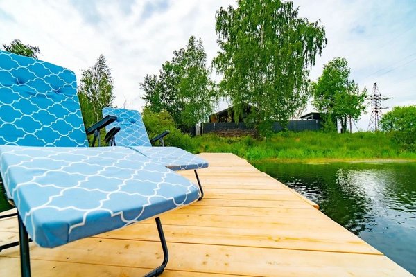 В 7 метрах от домиков находится небольшое озеро с мостиком и удобными шезлонгами, можно купаться и загорать.