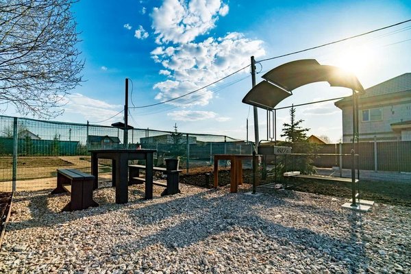 Неотъемлемой частью загородного отдыха станет еда, приготовленная на мангале. Для это есть оборудованная мангальная зона и обеденный стол со скамьями.