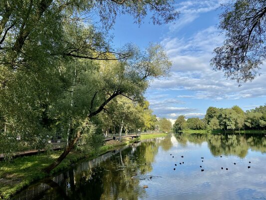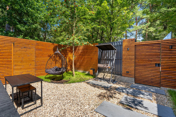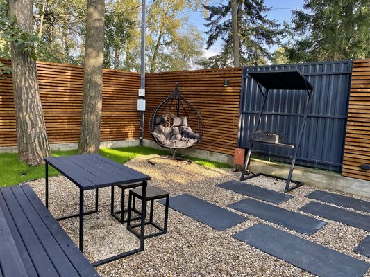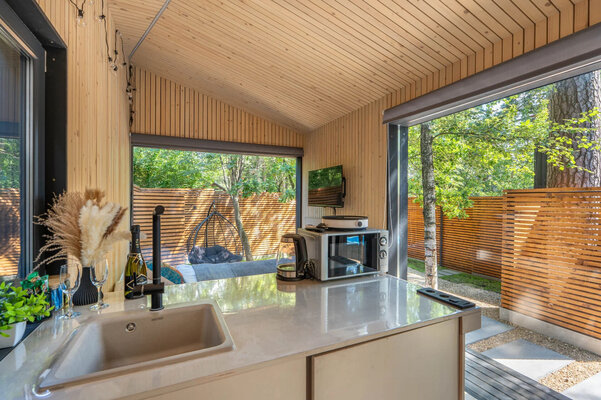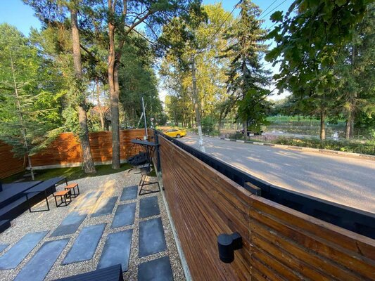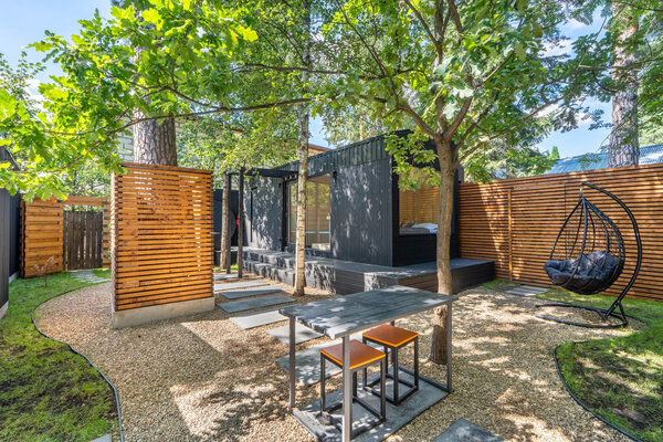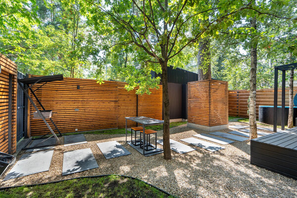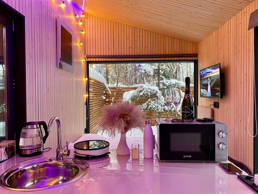 Внутри домика — полностью оборудованная кухня со всей необходимой техникой (холодильник, плита, микроволновая печь, чайник), а несколько систем отопления и современная очистка воздуха обеспечивают идеальный микроклимат. На уютной частной территории есть деревья, лавочки, подвесные коконы для релакса и мангал. А всего в 30 метрах расположен живописный пруд и ухоженный парк для прогулок.