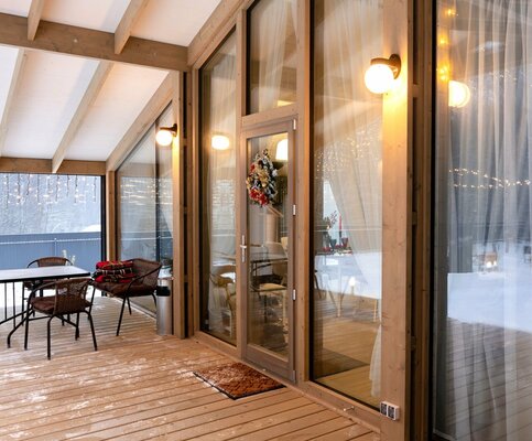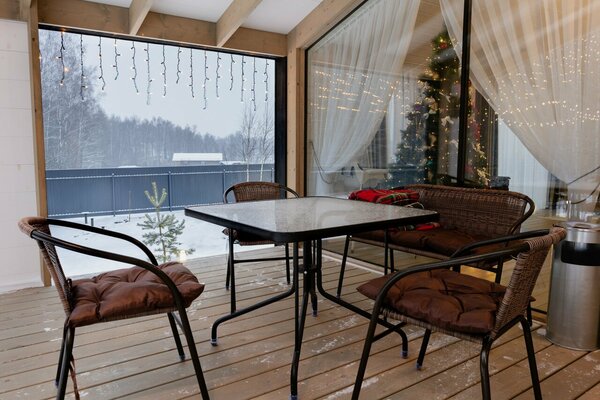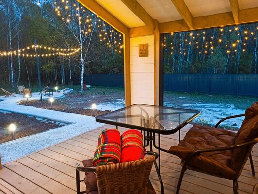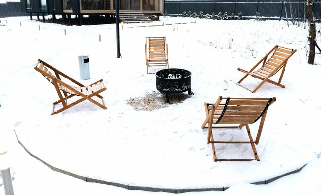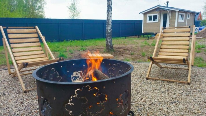 Уютная костровая зона, украшенная изящной подсветкой, приглашает к отдыху. Здесь, среди деревянных кресел и двух столиков, расставленных у мангала и костровой чаши, можно готовить на огне вкусные блюда и наслаждаться теплом дружеского общения в кругу близких.