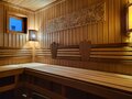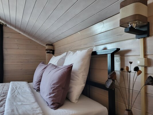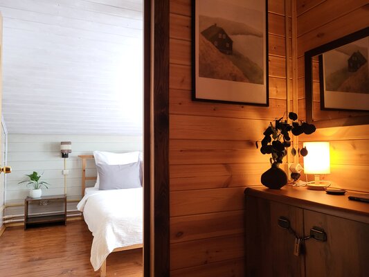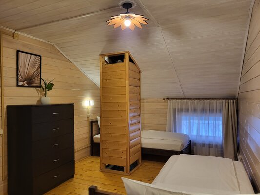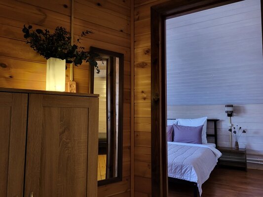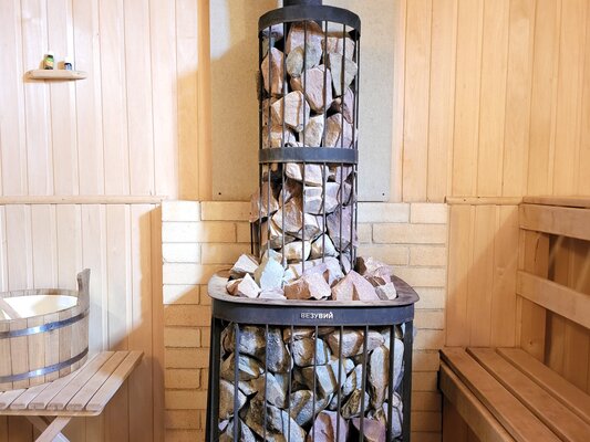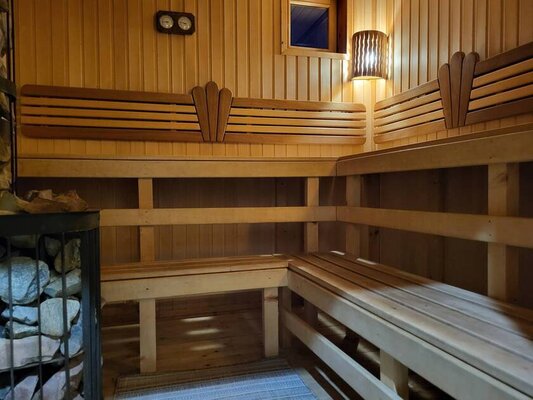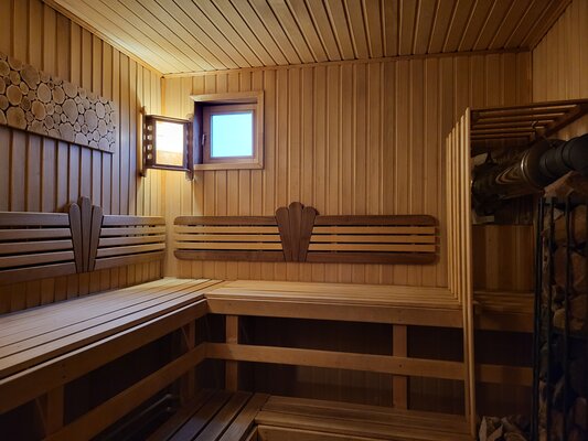 В каждом доме на первом этаже расположена баня: ее топят дровами через камин, и она прогревается примерно за сорок минут. У камина гостей встречает приветственная вязанка дров; при необходимости можно попросить у администрации дополнительные поленья за дополнительную оплату.