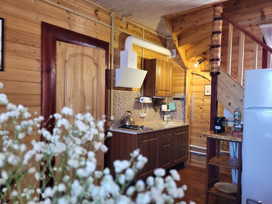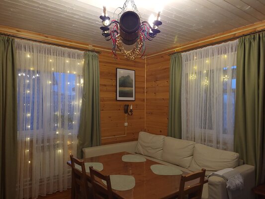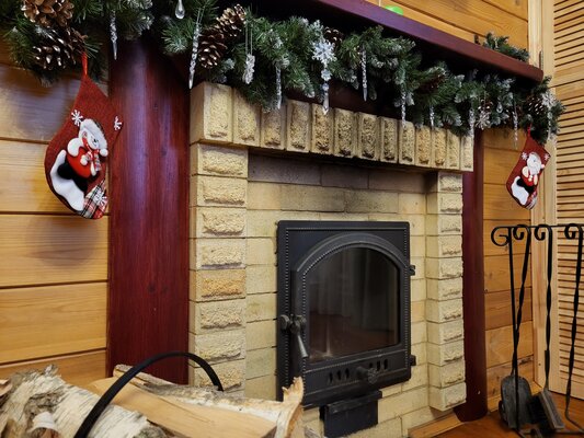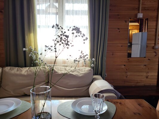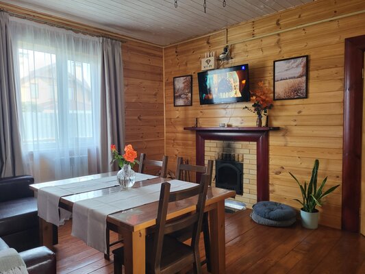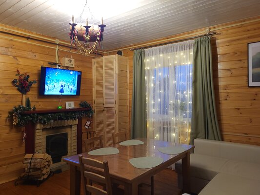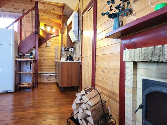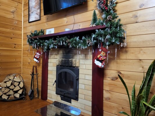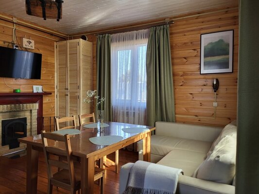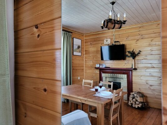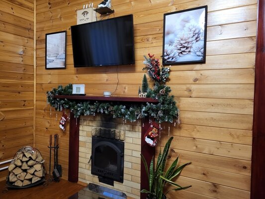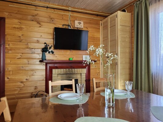 В гостиной установлен видовой камин, который можно разжечь дровами. Камин также выполняет функцию печи для бани. В стоимость проживания включена приветственная вязанка дров.