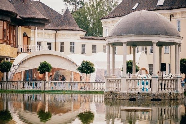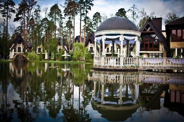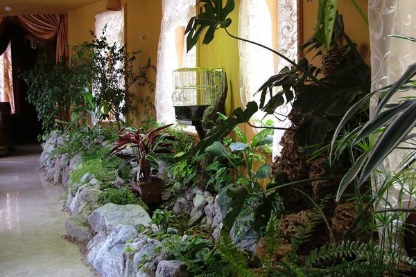 Четырехэтажное здание гостиницы построено в стиле модерн с элементами русского зодчества. Известные дизайнеры трудились над ее внутренним убранством, многие элементы которого выполнены по специальному заказу. Кованые лестницы и люстры, витражи – это авторская работа, достойная быть названной произведением искусства. Стены и потолки гостиницы покрыты семислойной краской с применением сусального золота, что воссоздает благородную атмосферу дворянской усадьбы. В зимнем саду нет повторяющихся растений. Второй этаж украшает галерея аквариумов с морской и речной водой.