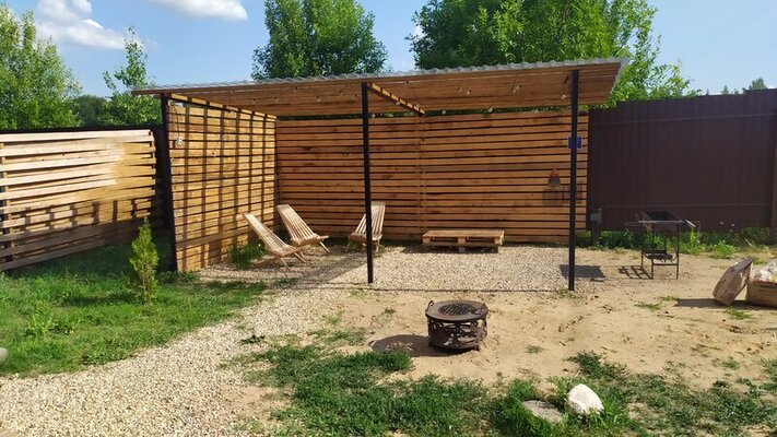 Выйдя на благоустроенный участок, вы попадете в объятия природы. Уютные шезлонги под навесом манят расслабиться и погрузиться в созерцание живописных окрестностей. А зона барбекю и костра позволит вам отведать изысканные блюда, приготовленные на свежем воздухе.