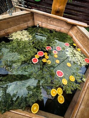 Наполнение чана цитрусовыми и вениками также делается гостями своими силами — для этого необходимо 2-3 грейпфрута и 3-4 веника, которые нужно запарить в горячем чане в течение 15-20 минут перед началом парения.