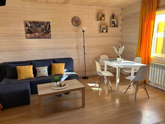 Для маленьких гостей подготовлены детские книги, деревянная железная дорога и игровой комплекс на улице. В стоимость проживания включён доступ в подогреваемый бассейн под куполом. Парковка на участке рассчитана на три автомобиля.