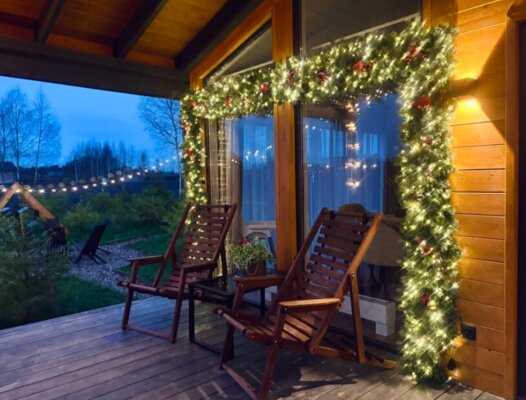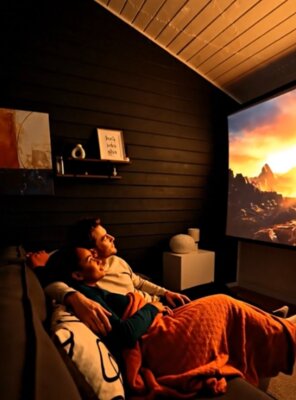 Экран 150 дюймов и проектор — летний кинотеатр на террасе с трансляцией фильмов с телефона.