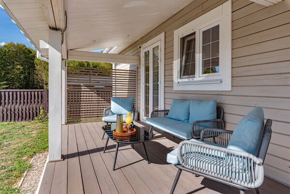 На прилегающей территории обустроена зона для барбекю с мангалом и костровой чашей, а также просторная меблированная веранда.