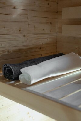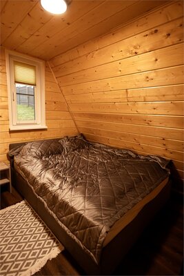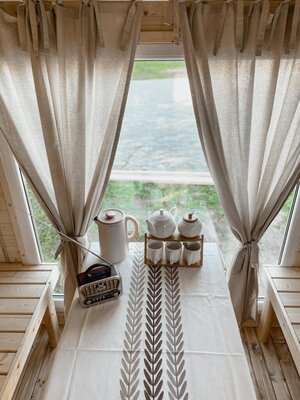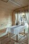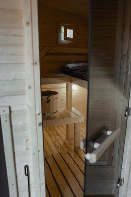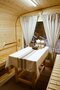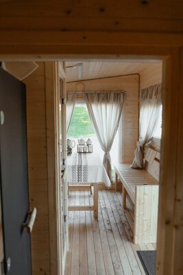 Внутри баня разделена на две зоны: просторная парная с двухъярусными полками и стеклянной дверью, а также уютный предбанник с деревянным столом и скамьями. Здесь можно не только переодеться и насладиться чаем, но и отдохнуть между посещениями парной, создавая атмосферу уединения и спокойствия.