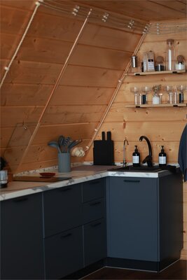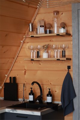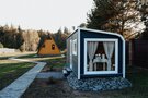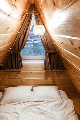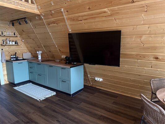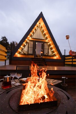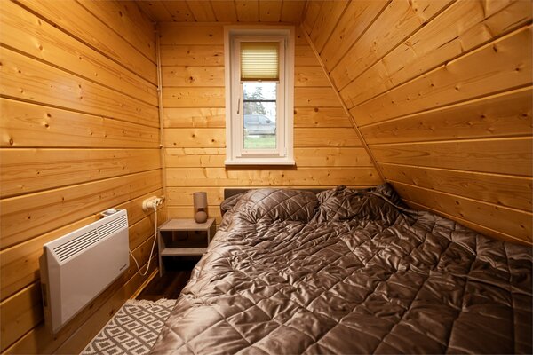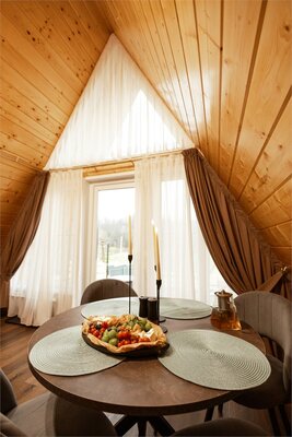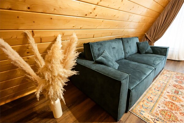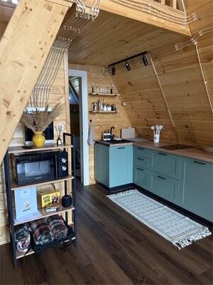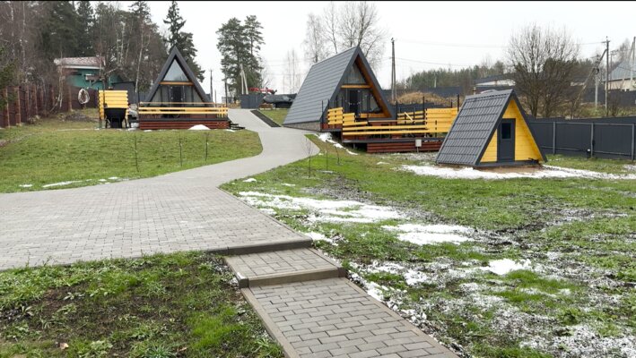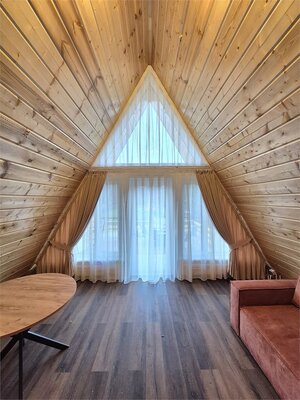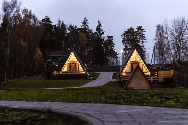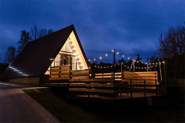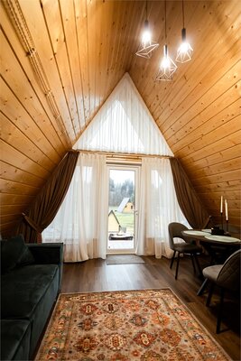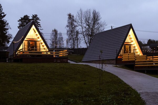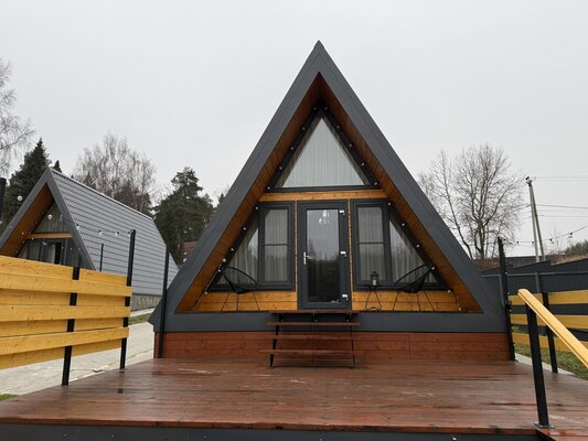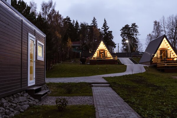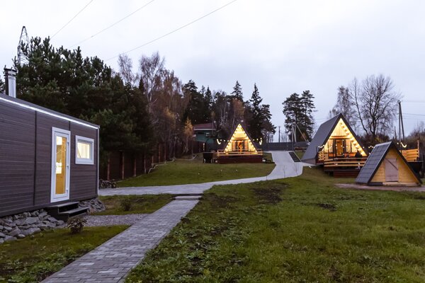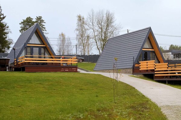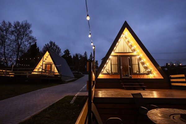 В «Ривер Хаус» время будто останавливается, позволяя полностью раствориться в красоте окружающей природы. Дома в форме A-frame, с их характерными треугольными крышами и панорамными окнами, предлагают убежище от городского шума и дарят ощущение уюта благодаря отделке деревом и приглушенному свету. Продуманный интерьер включает в себя просторную гостиную с удобным диваном, очаровательную кухню с живыми акцентами и две спальни под самым небом, откуда открывается вид на сосны.