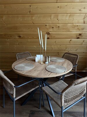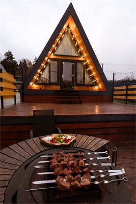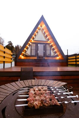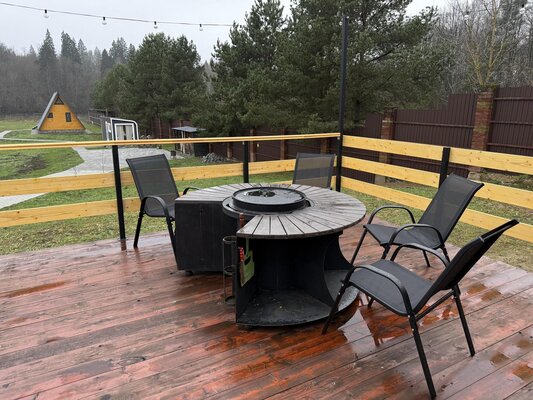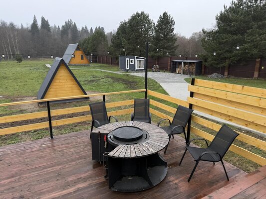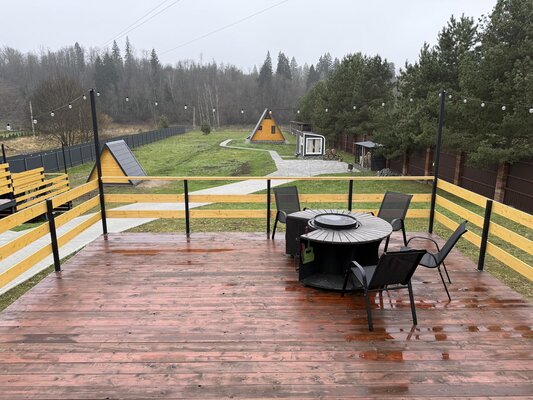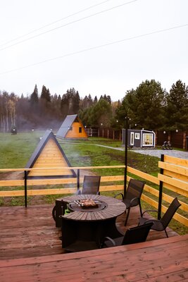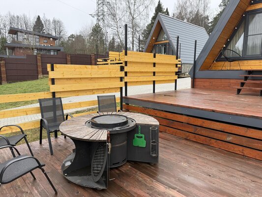 Сердцем «Ривер Хаус» является просторная терраса с уникальной круговой зоной барбекю, защищенной от ветра и украшенной гирляндами. Это идеальное место для теплых встреч с близкими, где можно приготовить вкусное угощение, согреться у огня с чашкой чая или глинтвейна и насладиться единением с природой.