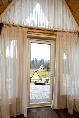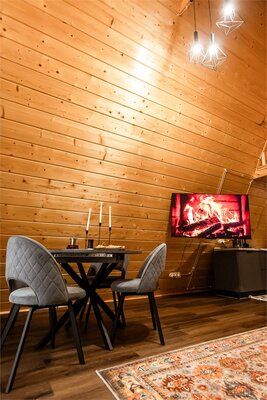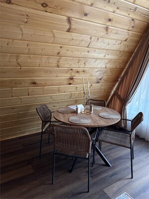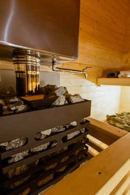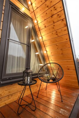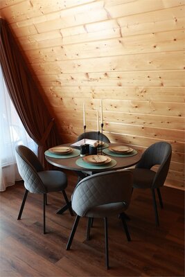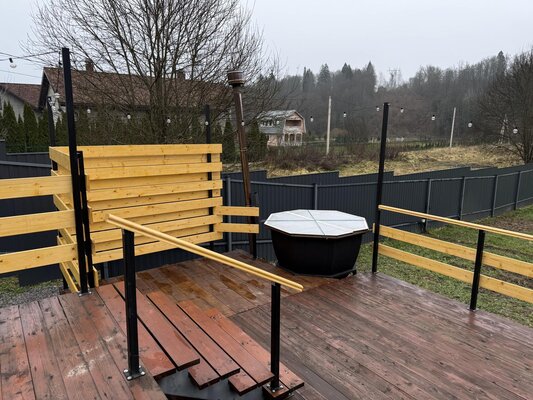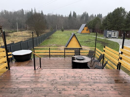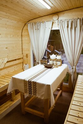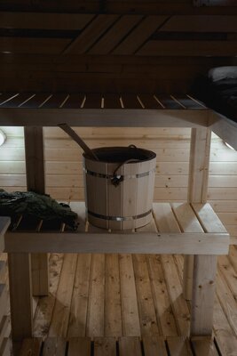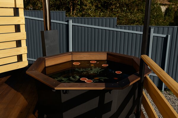 Для тех, кто ищет полного расслабления, к услугам гостей отдельный банный комплекс, построенный из натурального хвойного дерева и оснащенный дровяной печью, просторной парной и уютным предбанником. А прямо на террасе расположен чан с подогревом, создающий атмосферу безмятежности. Купание в горячей воде под открытым небом — это прекрасный способ восстановить силы и избавиться от стресса в любое время года.