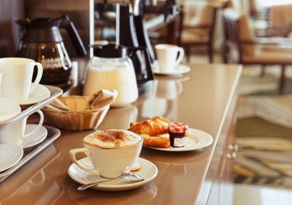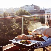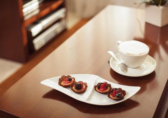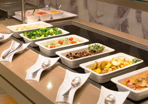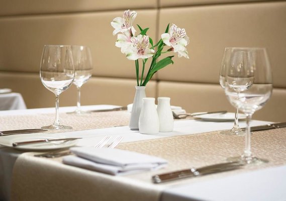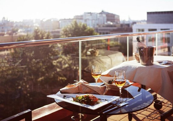 На территории есть собственный ресторан, в котором по меню можно заказать вкусные и изысканные блюда европейской кухни. Из окон открывается живописный вид на город. Также можно арендовать банкетный зал, чтобы провести праздник.