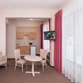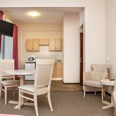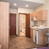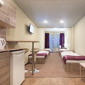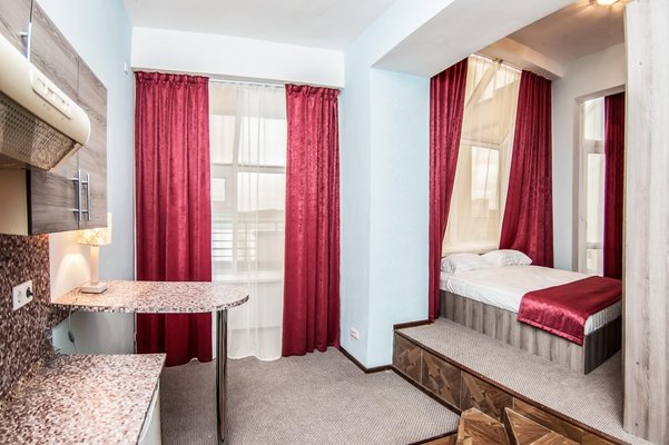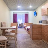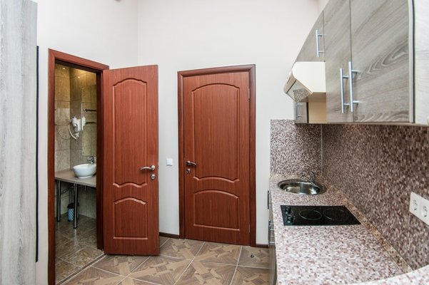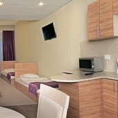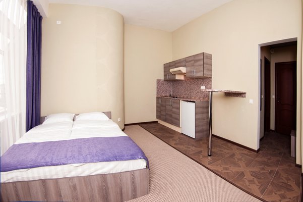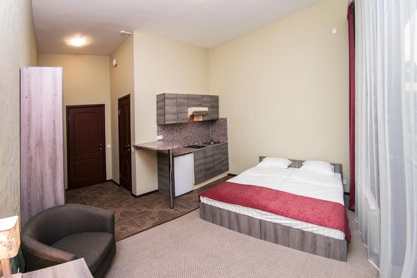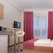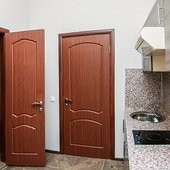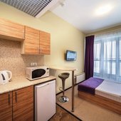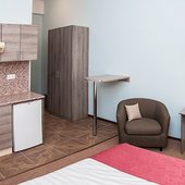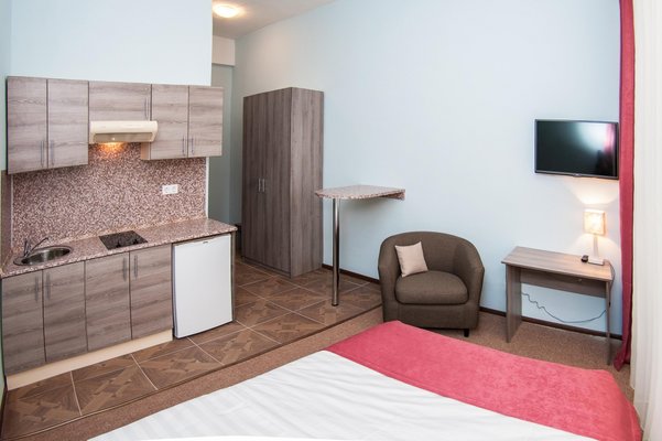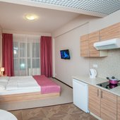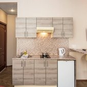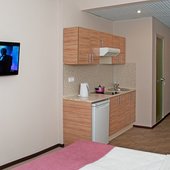 В номерах имеется собственная кухня с необходимо техникой и посудой для самостоятельной готовки. В соседнем доме находится крупный сетевой супер-маркет.