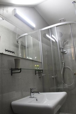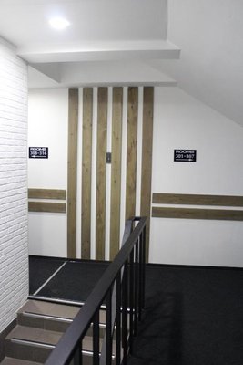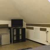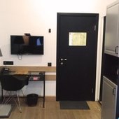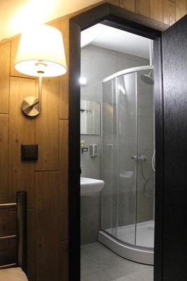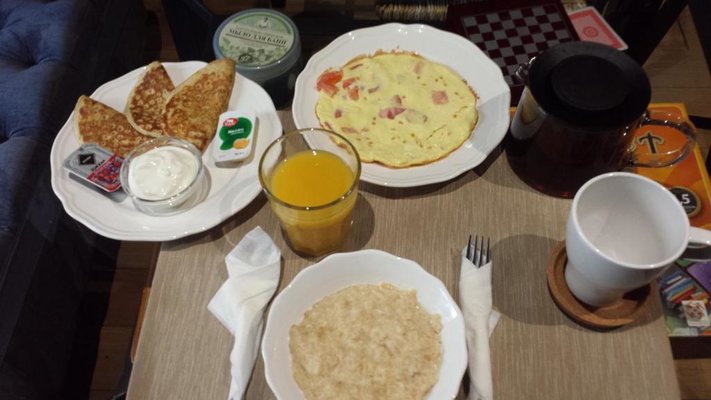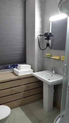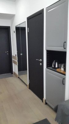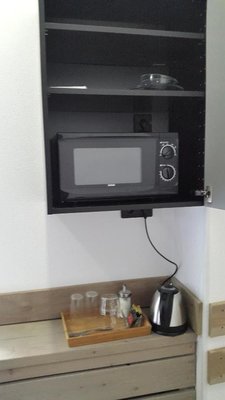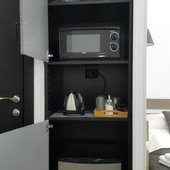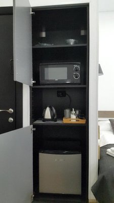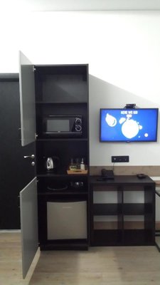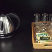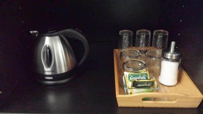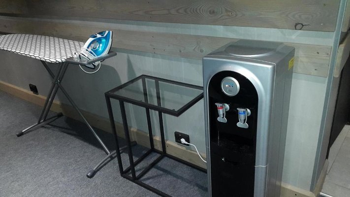 Для удобства гостей предусмотрена общая кухонная зона в холле, оборудованная микроволновкой, чайником, краном с фильтрованной водой, есть утюг и гладильная доска, также на кухне можно воспользоваться стиральной машиной.
