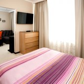 В номерном фонде 192 комнаты. Каждая из них оформлена с уютом и оборудована всей необходимой мебелью для Вашего комфорта: телевизор с плоским экраном и кабельным телевидением, кондиционер, Wi-Fi, шкафы и тумбочки для вещей. В ванной есть душевая кабина и набор полотенец.