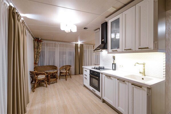 Пространство доступно круглый год: теплые полы, камин и кондиционер обеспечивают комфорт в любую погоду. Для приготовления блюд на свежем воздухе предоставляется мангал с необходимыми принадлежностями. Гости могут привезти продукты с собой или заказать блюда из ресторана.