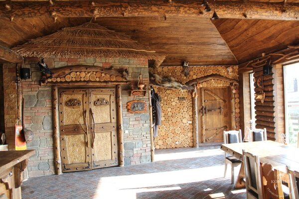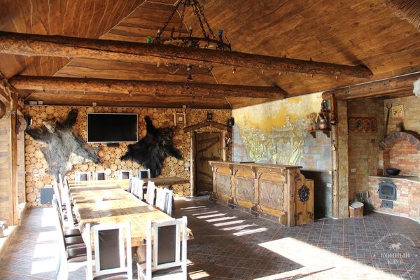 - просторный банкетный зал в стиле кантри и шале с панорамными окнами;