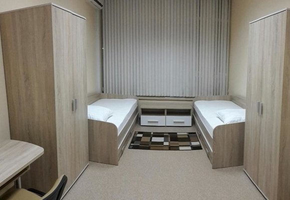 В номерах удобные кровати с матрасом, шкафчики индивидуального пользования, стол, стулья и постельное белье. Ванная комната общая, располагается на этаже. Персонал отеля регулярно проводит уборку жилых комнат.