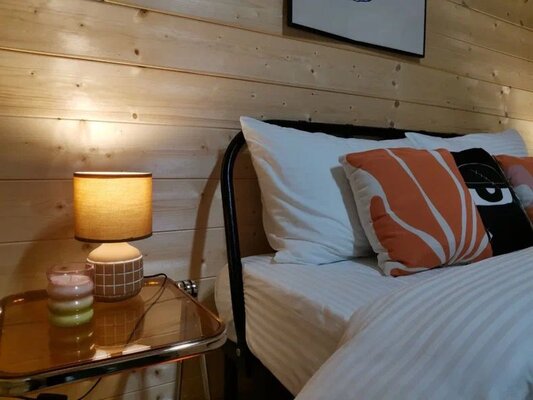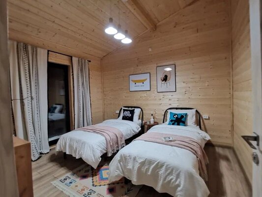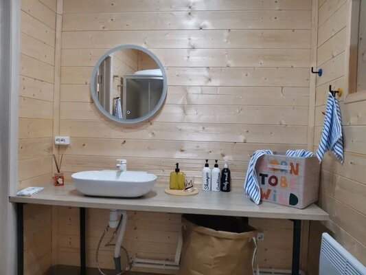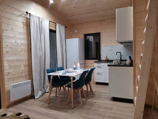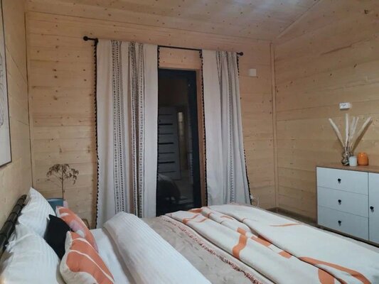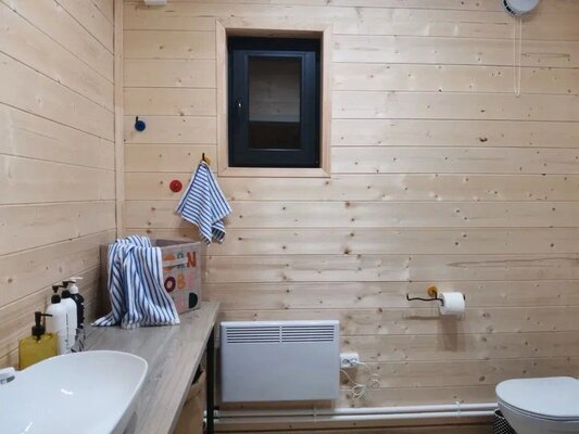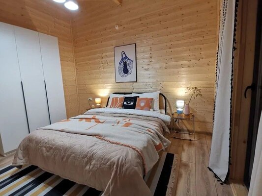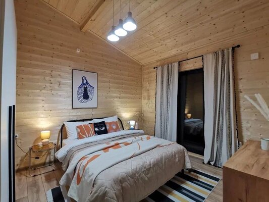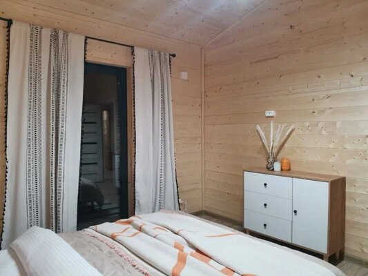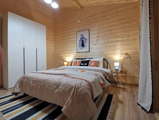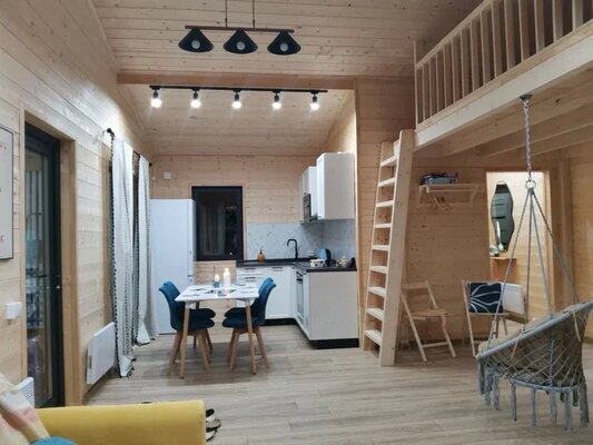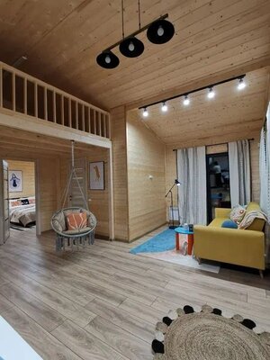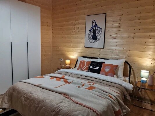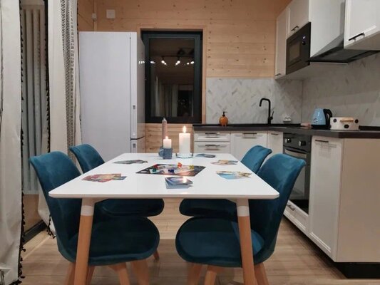 Комфортабельный дом вмещает до 6 гостей (включая детей). К вашим услугам: две односпальные и одна двуспальная кровати с ортопедическими матрасами, раскладной диван в зале, полностью оборудованная кухня (варочная панель, духовка, посуда на 6 персон), телевизор со множеством онлайн-кинотеатров, настольные игры, просторная веранда, мангал и закрытая парковка на два автомобиля. В ванной комнате — удобная душевая кабина и необходимые средства гигиены.