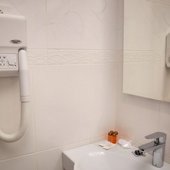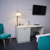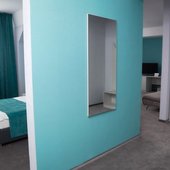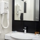 Отсутствие полотенцесушителя в номере, неприятный запах в ванной комнате, высокая слышимость соседей за стеной, недостаточная освещенность номера, отсутствие чайника, ужасное обслуживание посетителей в кафе при отеле.