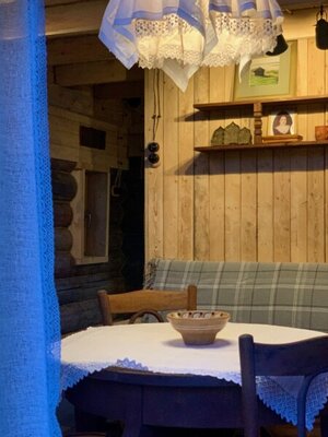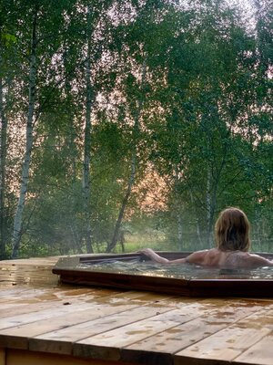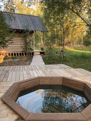 К каждому домику пристоен в некотором отдалении среди деревьев чан. Наполняется он чистейшей родниковой водой и топится березовыми дровами.