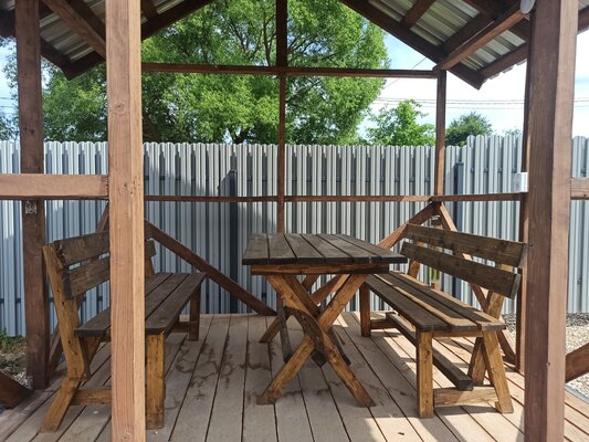 Просторная беседка с удобными местами для отдыха.