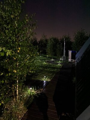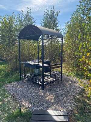 На территории расположены крытый мангал с лавочкой, уютная садовая мебель из ротанга и купель с цветной подсветкой. Предусмотрена парковка на 3 автомобиля под круглосуточным видеонаблюдением.