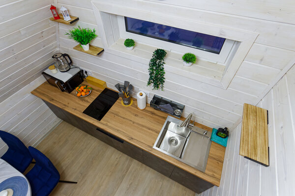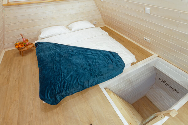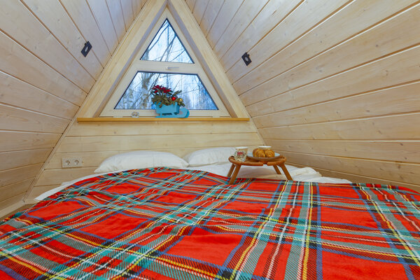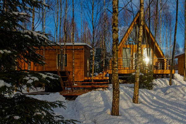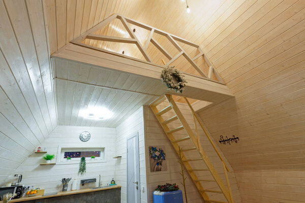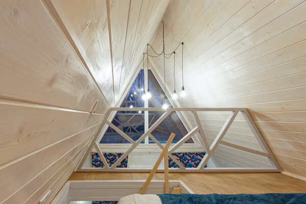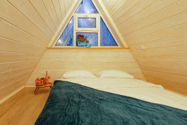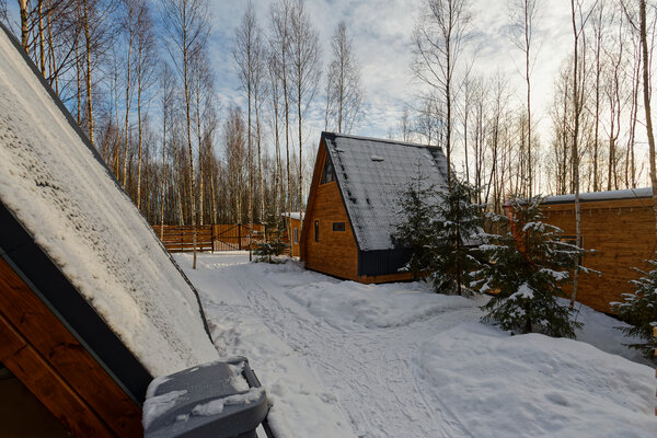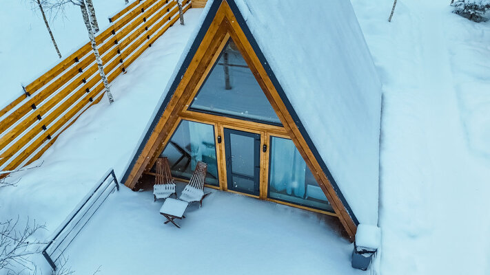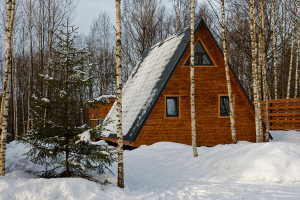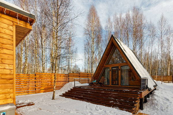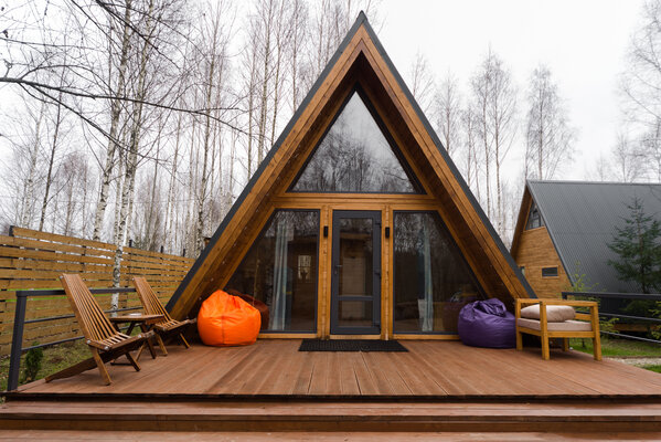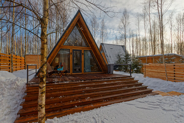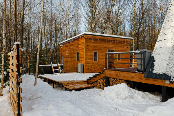 У домика А-фрейм есть еще баня.