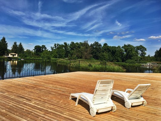Всем привет. Недавно с мужем побывали на базе отдыха в Звенигороде (Ок река). Впечатления остались положительные. Начну сначала. База отдыха находится на закрытой территории, в паре километров от города, в случае если нужно что то купить, добираться не долго. На территории базы расположены домики на весу (бунгало), и таким образом получается, что под каждым домом есть два паковочных места...