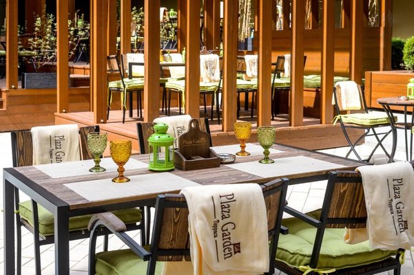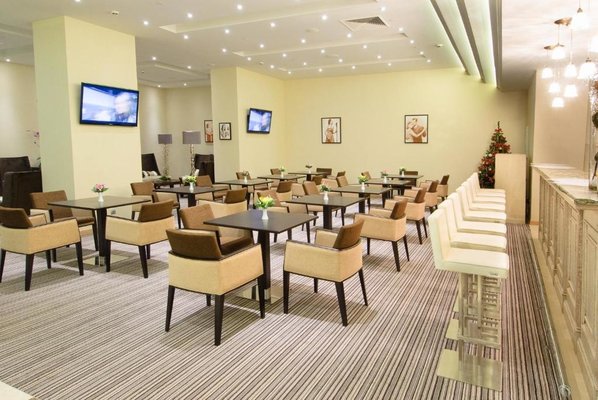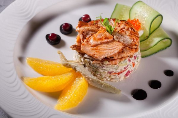 Каждое утро сервируют сытные завтраки, которые состоят из большого многообразия блюд. Также работает ресторан, в котором по меню можно заказать изысканные блюда русской и европейской кухонь.