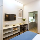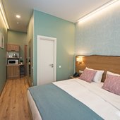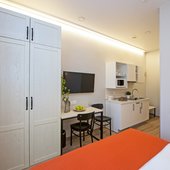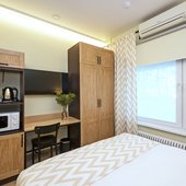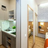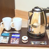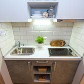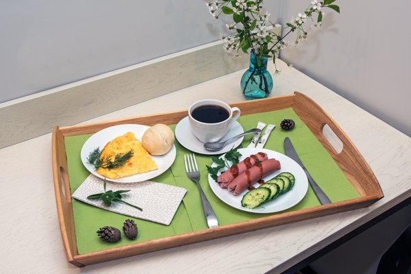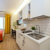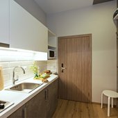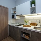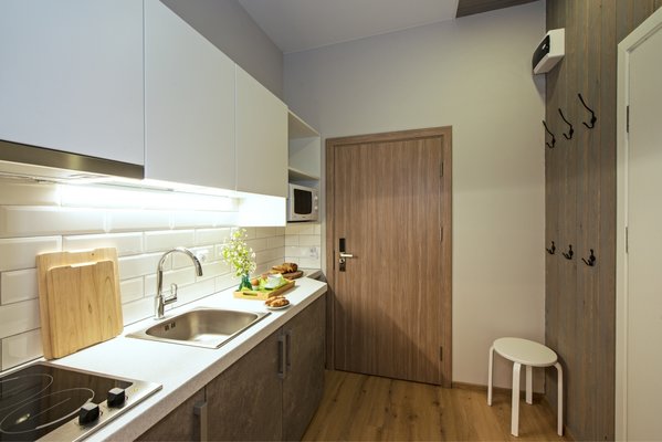 Во всех номерах имеется СВЧ-печь и набор посуды, холодильник и электрический чайник. В апартаментах обустроена кухонная зона на которой гости смогут готовить свои любимые домашние блюда.