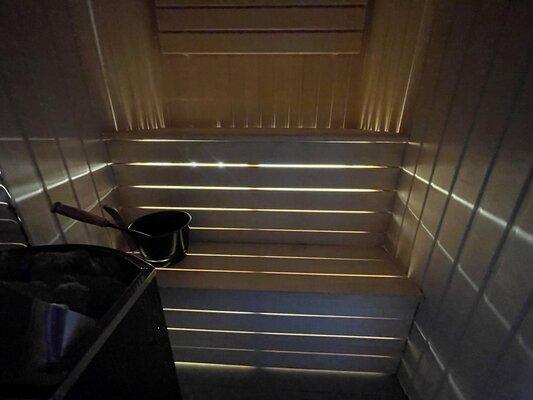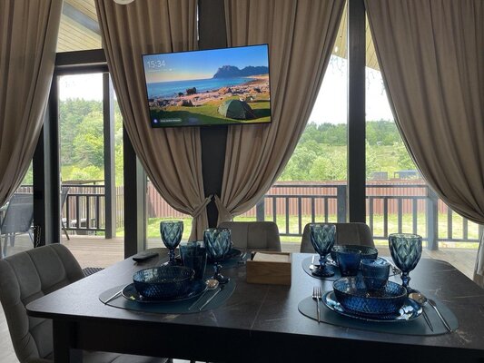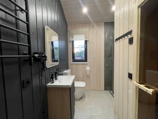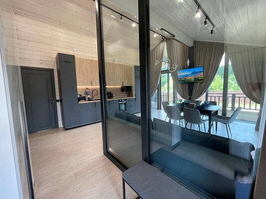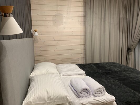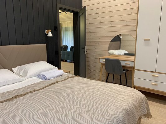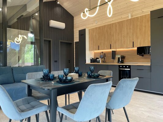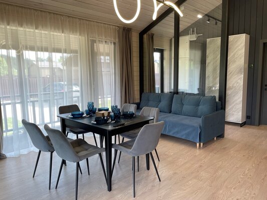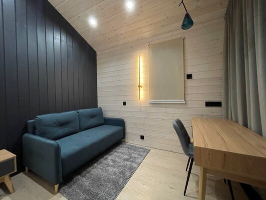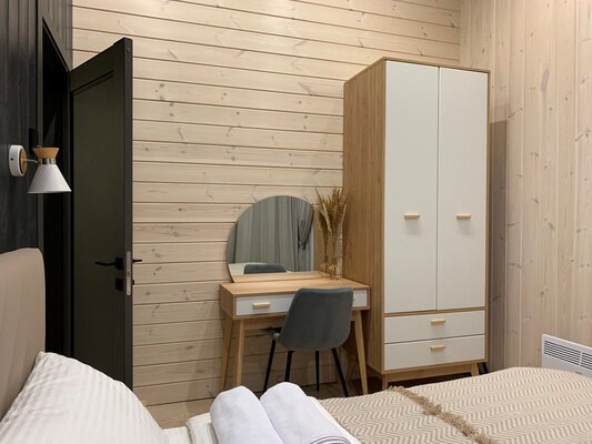 В доме есть всё необходимое для комфортного отдыха: три уютные спальни с ортопедическими матрасами, кухня-гостиная, полностью оборудованная современной бытовой техникой и посудой, чистые бельё и полотенца, средства гигиены, Wi‑Fi и Smart TV со встроенной Яндекс-станцией. Для приятного расслабления предусмотрена электрическая сауна на двоих с просторной душевой.