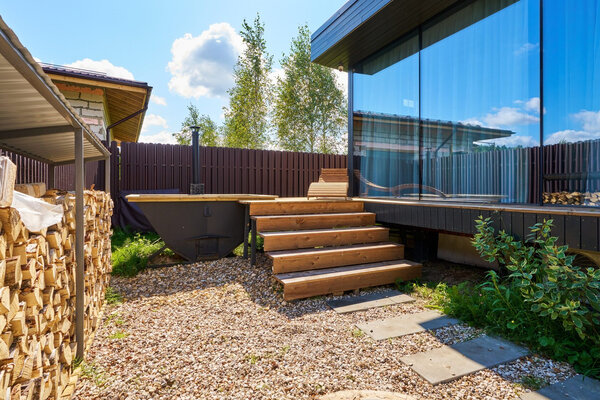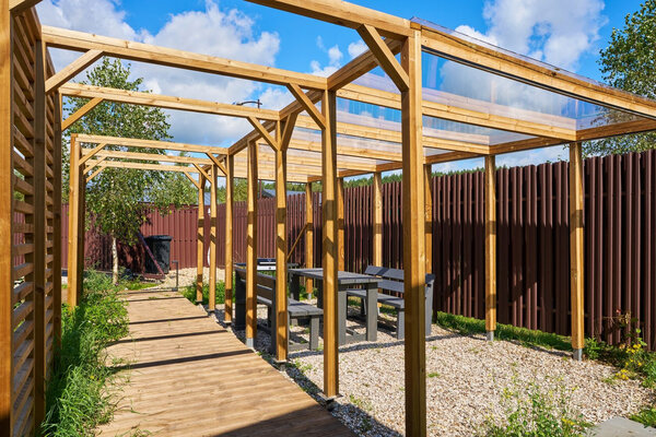На территории есть индивидуальная зона для барбекю, где гости могут приготовить разнообразные блюда на открытом огне. Здесь установлены удобные скамейки, позволяющие комфортно расположиться за столом и наслаждаться свежим воздухом в компании друзей и близких.