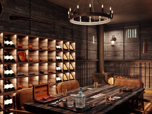 Атмосферное пространство с винным казино, сигарным сервисом и уютным теплом винтажной чугунной печи.