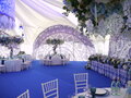 Шатер площадью 260 м² с шестигранной формой, высотой входа 4,5 м и куполом 6,3 м обеспечивает простор и изысканность. Он вмещает до 260 гостей при фуршете или до 160 человек за круглыми столами. В стоимость аренды уже включены: напольное покрытие, драпировка потолка, банкетная мебель, автономный туалетный модуль, а также уборка и вывоз мусора после мероприятия — все для вашего комфорта и беззаботной подготовки к торжеству.